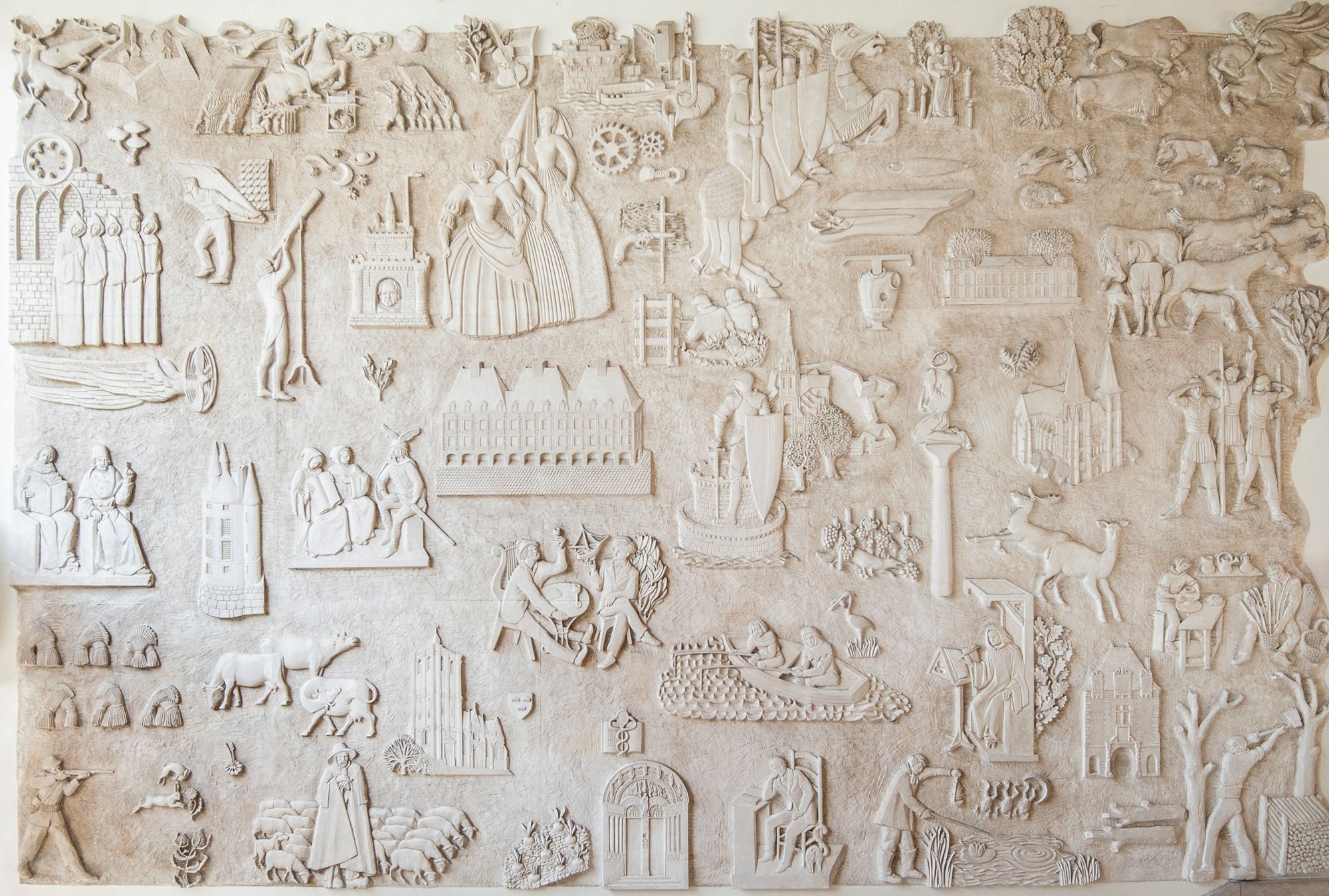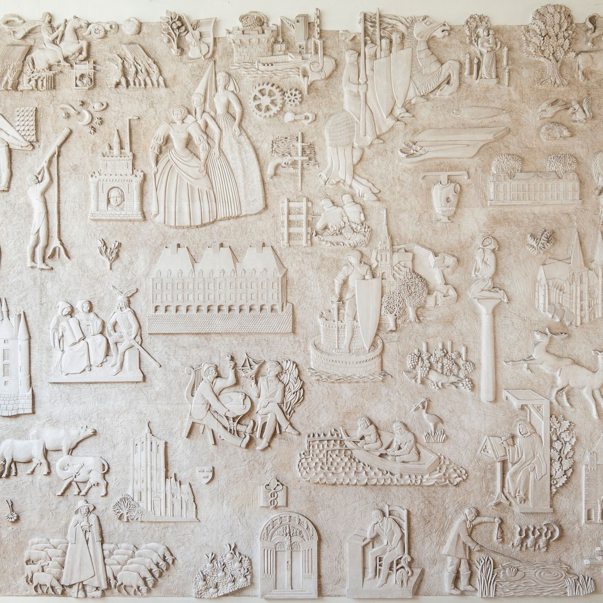 Le bas-relief situé dans le hall des Archives départementales des Ardennes a été réalisé en 1957 par le sculpteur ardennais Paul Bialais. Né en 1926 à Nouzonville, Paul Bialais, qui se destine d’abord à entrer dans les ordres, se tourne dès 1950 vers la sculpture.