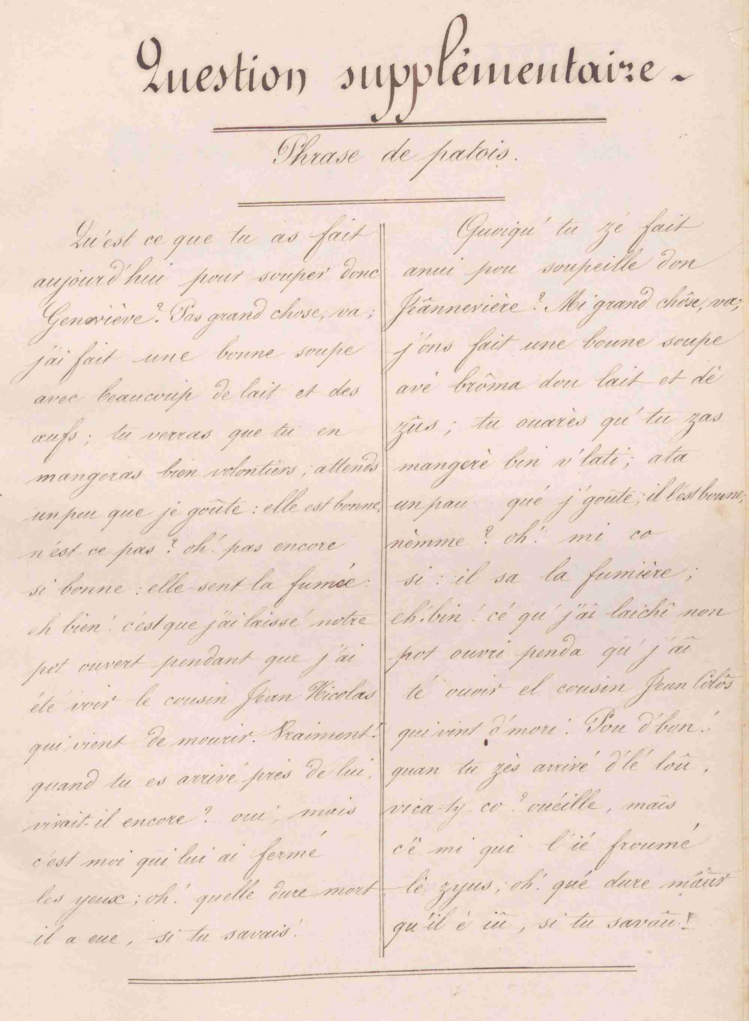 Il est à noter que la dernière thématique, le patois, a certainement dû être rajouter a posteriori puisqu’il s’agit souvent d’un papier collé en fin de questionnaire.