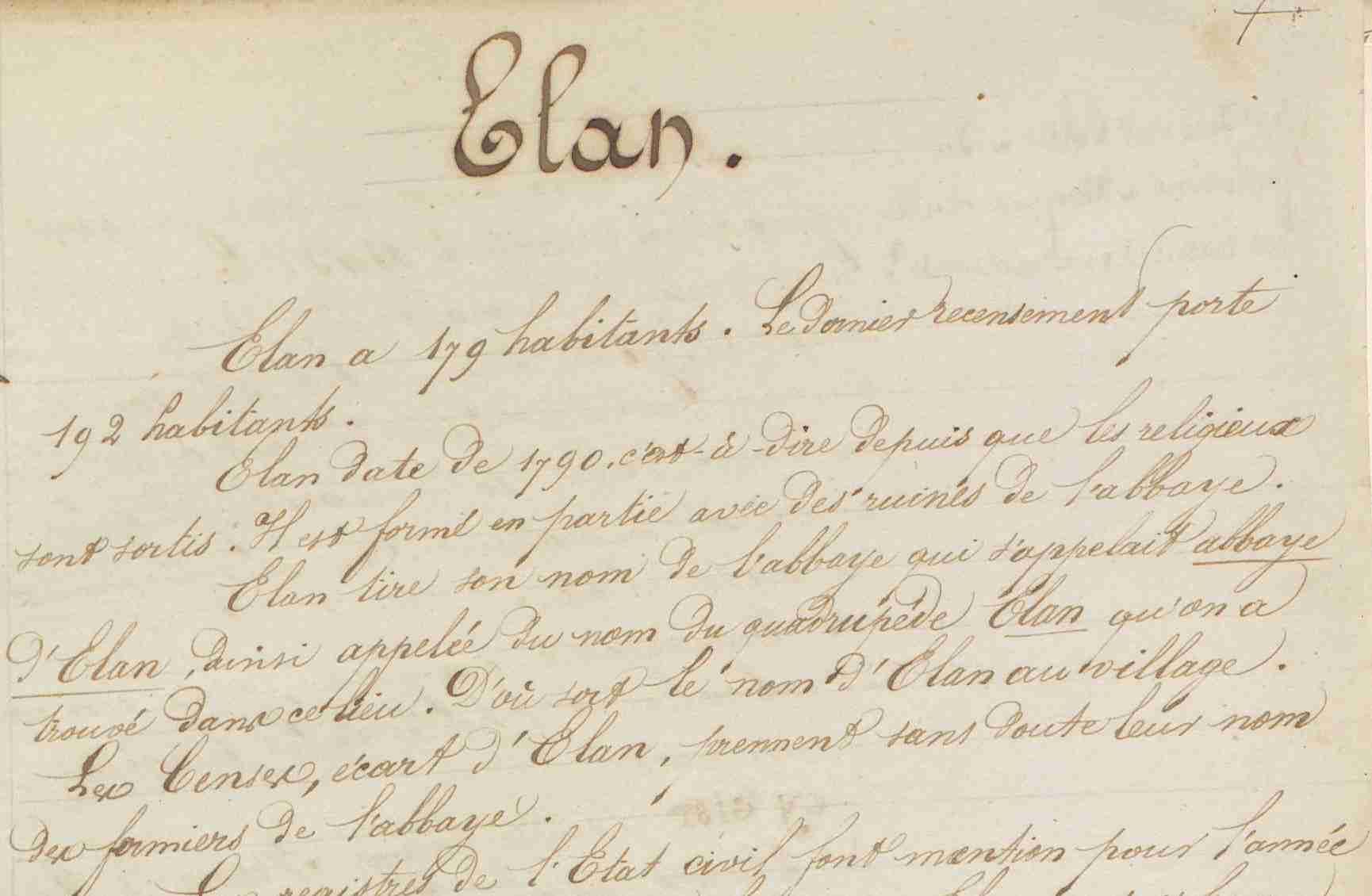 Une lecture approfondie permet enfin d’y découvrir quelques écrits savoureux. L’exemple de la commune d’Élan est le plus frappant. Quel est d’après vous, l’origine du nom de la commune selon l’instituteur d’alors ? son nom proviendrait de l’abbaye d’Élan, ainsi appelé du nom du quadrupède Élan qu’on a trouvé en ce lieu… vraiment ?