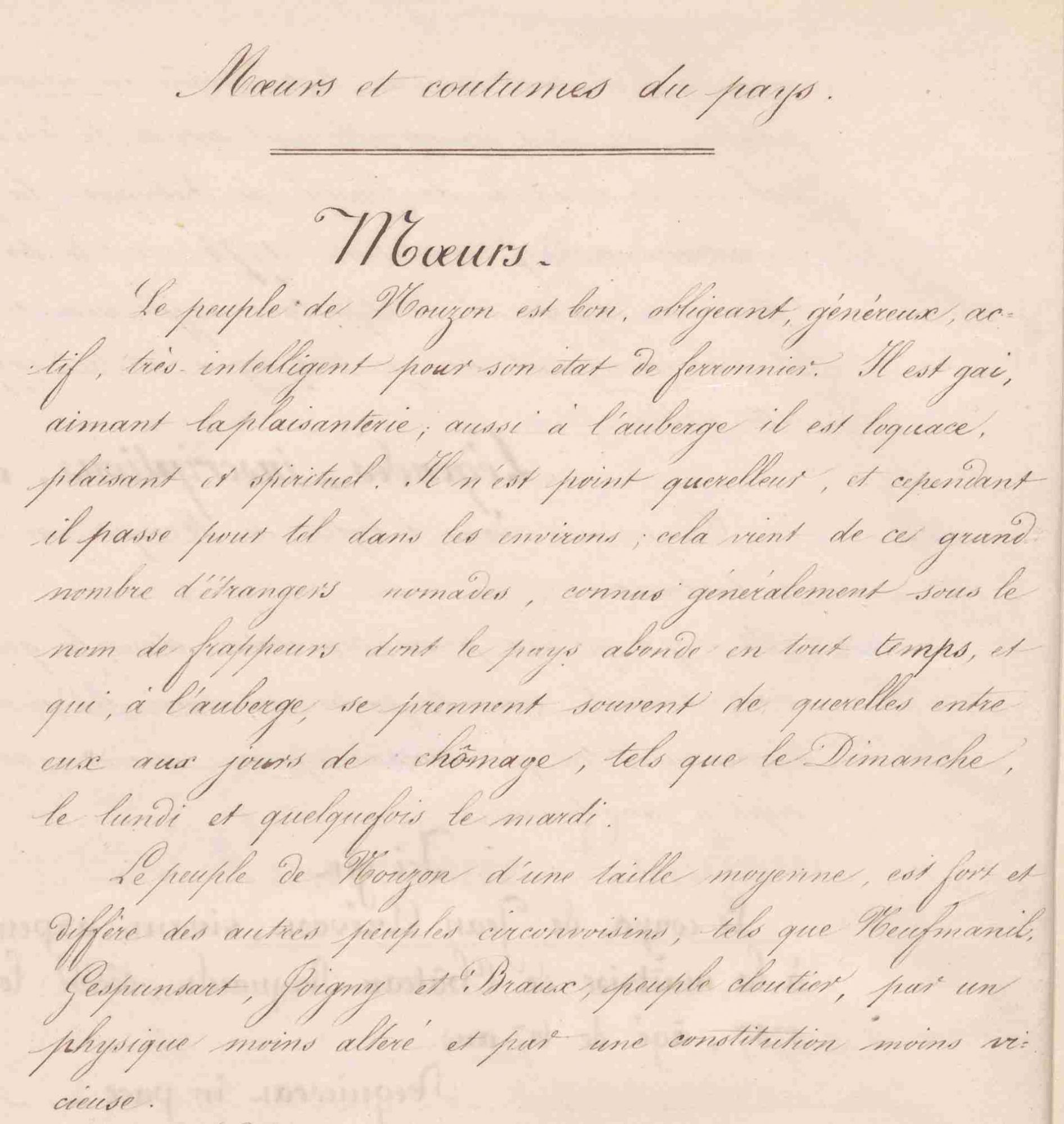 Mais certains enseignants, semblant considérer l’Ardennais moyen comme inférieur à leur état d’instituteur écrivent que les habitants « laissent à désirer sous le rapport de la civilisation », « ils vivent entre eux en mauvaise intelligence » ou alors comparent des communes limitrophes : « …Très intelligent pour son état de ferronnier,… le peuple de Nouzon, d’une taille moyenne, est fort et diffère des autres peuples circonvoisins, comme Neufmanil, Gespunsart, Joigny et Braux, peuple cloutier, par un physique moins altéré et par une constitution moins vicieuse. »