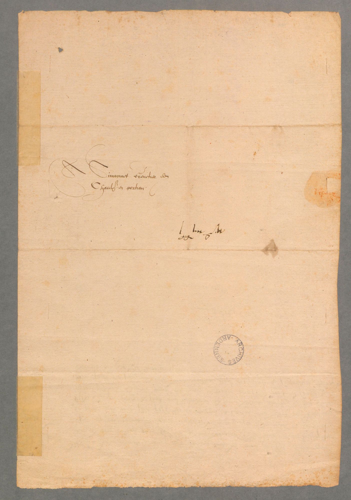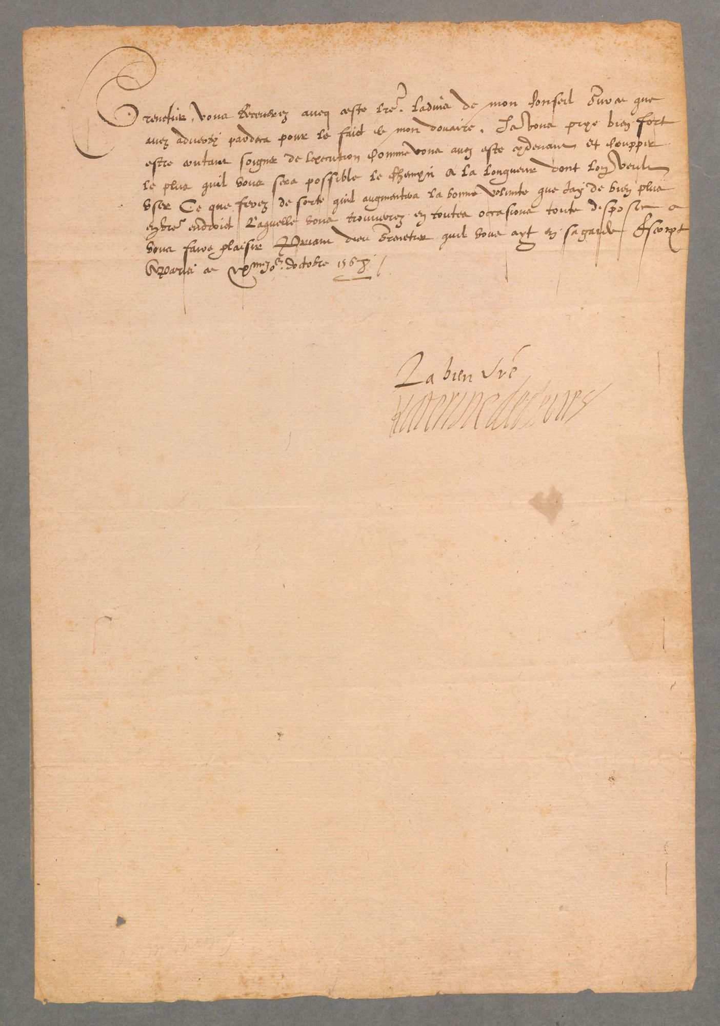« Grenetier vous recevrez aveq cestre lettre ladvis de mon conseil sur ce que avez averti par deçà pour le faict de mon douaire. Je vous prye bien fort estre content soigné de lexécution comme vous avés esté cydevant et coupper le plus qu’il vous sera possible le chemyn a la longueur dont l’on veut estre ce que ferai de sorte qui augmentera la bonne volonté que jay de bien plus en votre endroict laquelle vous trouverez en toutes occasions toute disposition à vous faire plaisir. Priant Dieu grenetier qu’il vous ayt en sa garde.
