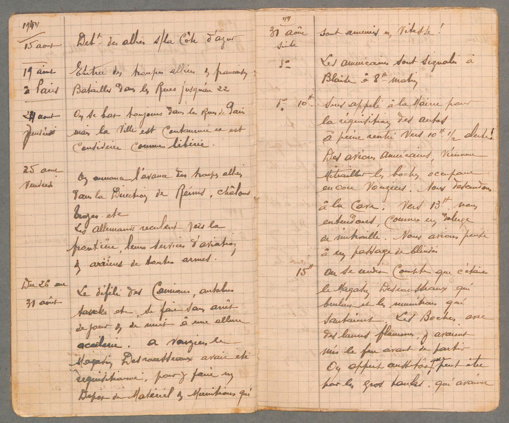 Le carnet reprend au 10 mai 1939. Il inscrit certaines attaques ou mouvements puis note au jour le jour son évacuation de Vouziers et son retour. Il n’inscrit rien pour 1941 et 1943. Pour 1944, il mentionne certains évènements puis le récit de la libération de Vouziers le 31 août 1944 et les jours qui suivent. Ce récit permet d’appréhender les conditions de vie de la population notamment ses liens avec l’extérieur : téléphonie, poste, gare, route et pont. L’avant-dernière page du carnet est consacrée à la taille de ses trois enfants entre 2 et 17 ans. La dernière page retrace brièvement son parcourt militaire. Enfin, est collé sur la page intérieure de la couverture, un plan plié dessiné à la main et retraçant les étapes de l’évacuation de 1939 et notamment le retour depuis Fouras (Charente-Maritime).