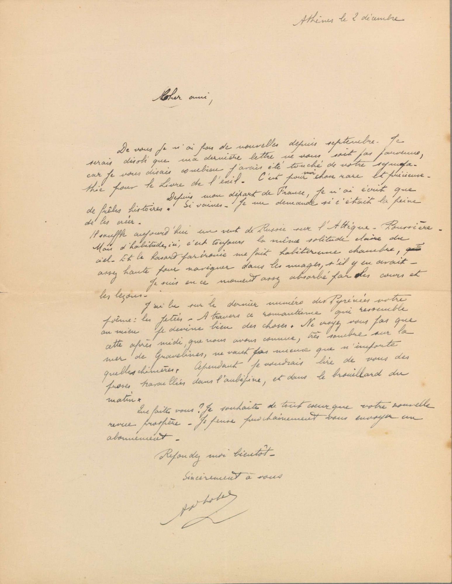 Ces quelques lettres ont été écrites par l’écrivain ardennais André Dhôtel (1900-1991) à son ami Pierre Leprohon (1903-1993), écrivain et critique littéraire et cinématographique. Elles appartiennent à un ensemble de correspondance constituée de 97 lettres écrites entre les années 1920 et les années 1940. Elles évoquent leur amitié littéraire et notamment le séjour de Dhôtel à l’Institut français d’Athènes entre 1924 et 1928. Ces lettres sont accompagnées de plusieurs manuscrits autographes de poèmes, de son faire-part de mariage avec une carte signée par les mariés. Elles ont été écrites dans les différents endroits fréquentés par l’écrivain : Attigny, sa ville natale, à Saint-Lambert-et-Mont-de-Jeux, où il possède sa résidence dans les Ardennes, ainsi qu’à Athènes, Provins et à Paris, où il a possédé une résidence, à Charolles (Saône-et-Loire) et à Valognes (Manche) où il a séjourné pour les vacances.