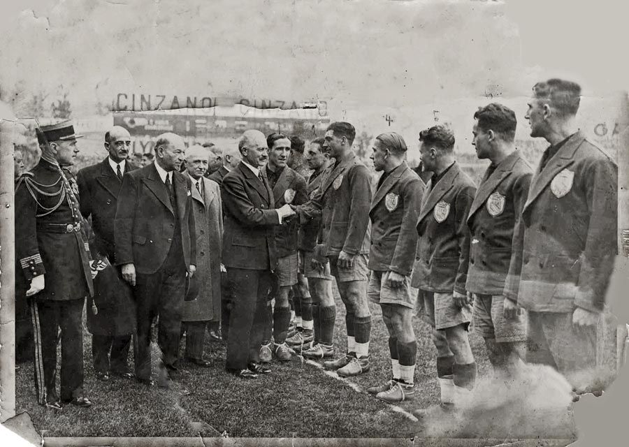 Le Président de la République Albert Lebrun, accompagné par le Président du Conseil général des Ardennes Lucien Hubert, salue les joueurs du Football Club Olympique de Charleville. Vêtus d’un blazer en flanelle bleu foncé, les finalistes carolopolitains sont présentés par leur capitaine Helenio Herrera.