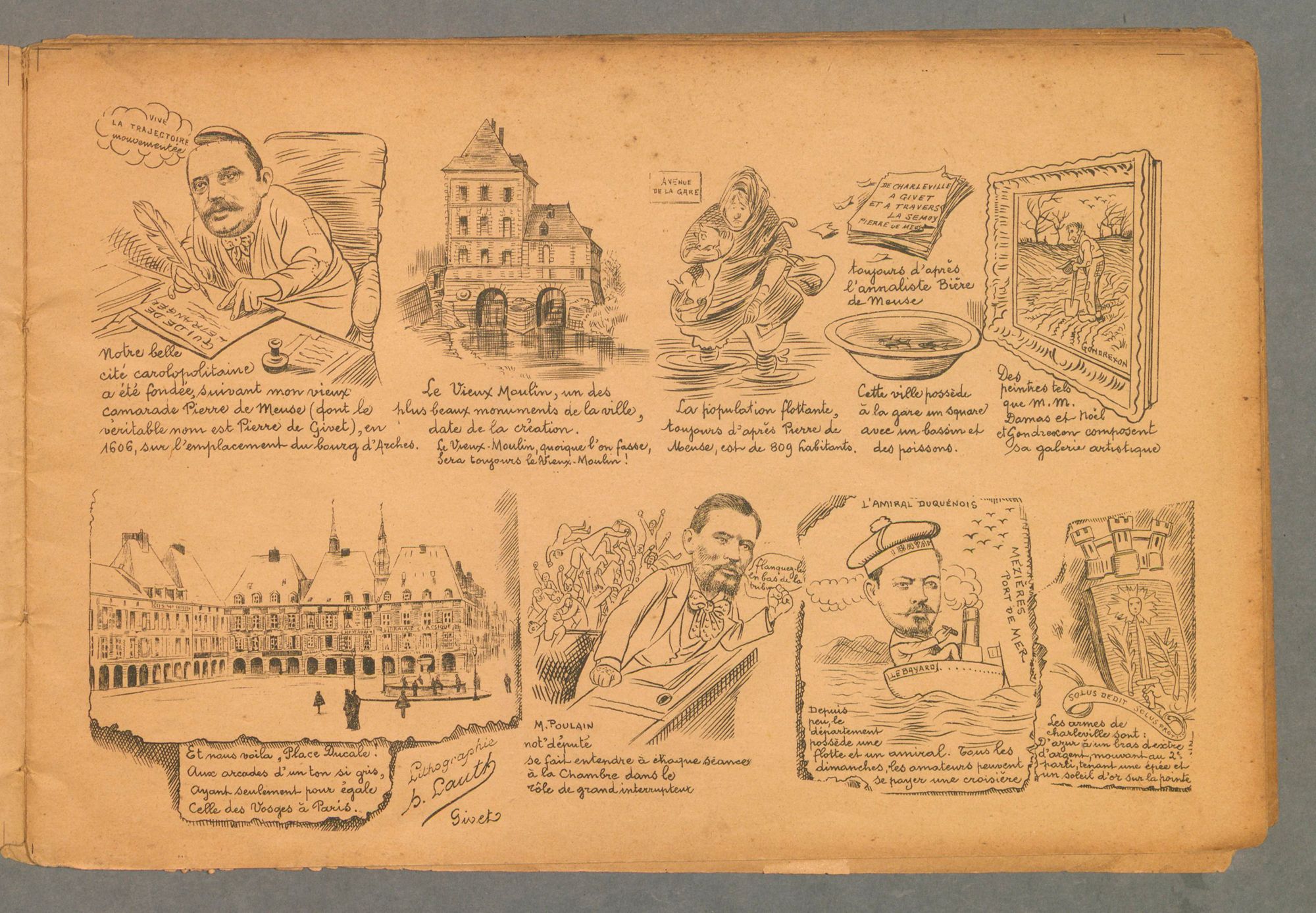 La version numérisée de La Vie ardennaise illustrée est disponible sur le site internet des Archives départementales. Les AD08 conservent également un recueil coté en 1J 132. Il est constitué de 46 pages (24 illustrées). Tristan De Pyègne y présente les « curiosités naturelles, industrielles, commerciales, artistiques et individuelles de chacune des localités de notre beau département ». On y retrouve son style caractéristique avec des personnages à grosse tête, réalisée de manière réaliste, et petit corps. Parfois son style se fait plus « cartoon » quand il dessine des chevaux par exemple. L’artiste se caricature lui-même à plusieurs reprises et se fait parler. L’album débute par Charleville, puis Mézières, Sedan, Revin, Vouziers, Carignan, Château-Porcien, La Horgne, Rethel. Comme dans La vie ardennaise illustrée, on y retrouve de nombreuses personnalités ardennaises de l’époque : députés, conseillers généraux, maires, militaires, médecins, personnel de l’administration préfectorale et personnalités du monde de la culture. Les noms et prénom de chacun ne sont pas toujours inscrits à côté de leur caricature puisque les contemporains de Tristan de Pyègne connaissaient certainement ces personnalités. De même, le lecteur du XXIe siècle doit connaître le contexte d’alors pour comprendre tous les commentaires humoristiques du caricaturiste/journaliste. De Pyègne dessine aussi quelques lieux comme le vieux moulin, la place ducale ou encore le mont Olympe à Charleville. Aucune femme n’est caricaturée. Une cycliste anonyme est représentée à la 1ère page consacrée à la ville de Sedan, avec pour légende « Beaucoup de cyclistes d’un sexe opposé à Turenne (voyez pouce) dans cette Ville ». À une autre page une femme berce un bébé avec en légende « Revin, « vieille ville espagnole », le type andalou est conservé par la population féminine ». Quelques autres femmes illustres des publicités.