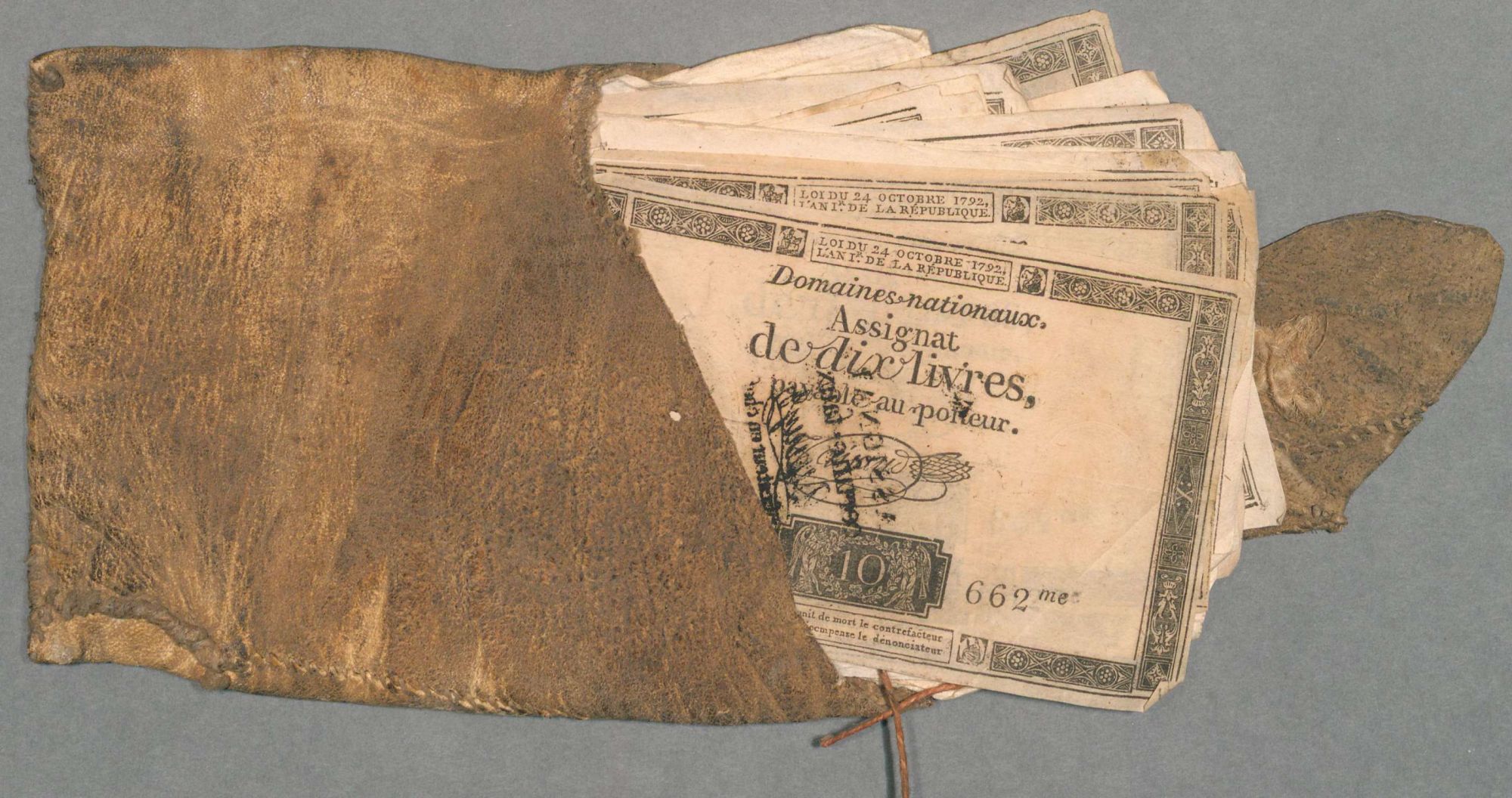 Les archives du Tribunal criminel des Ardennes sous la Révolution contiennent quelques rares pièces à conviction dont un portefeuille en cuir rempli d’assignats. Les assignats, créés au départ en 1790 comme des titres d’emprunt, deviennent en 1791 une monnaie papier. Ces billets connaissant rapidement une dépréciation de leur valeur et de nombreuses contrefaçons, l’Assemblée Nationale vote des lois punissant sévèrement les personnes refusant ce moyen de paiement et les faux-monnayeurs.