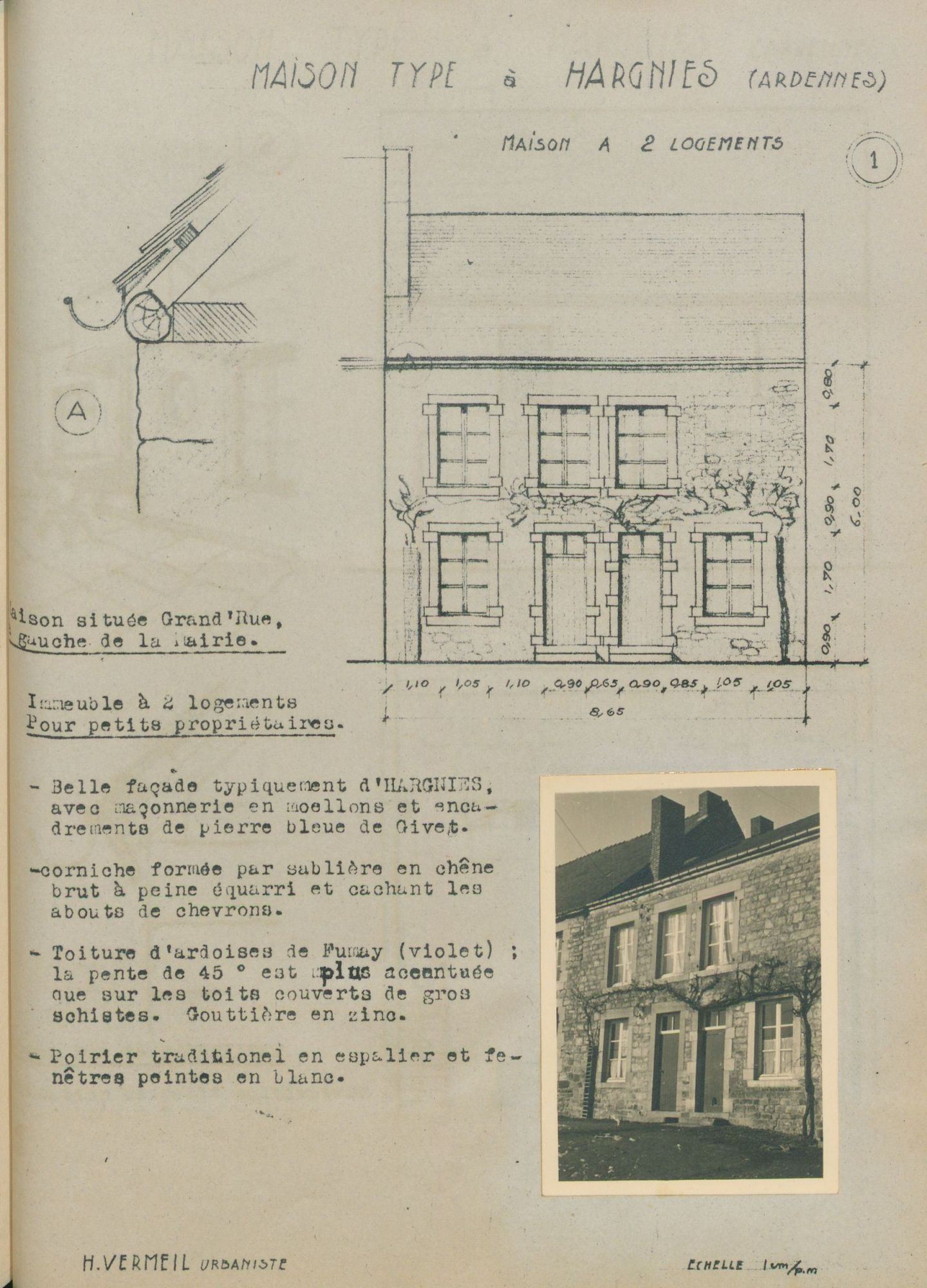 Ces documents révèlent aussi chez Henri Vermeil un intérêt pour l’architecture locale et un souci de la respecter dans ses projets de reconstruction. Dans ses rapports, aussi bien dans celui d’Hargnies que dans celui de Revin, est présente une partie illustrée de plans et de photographies où il décrit l’esthétique et le caractère de l’habitat local.