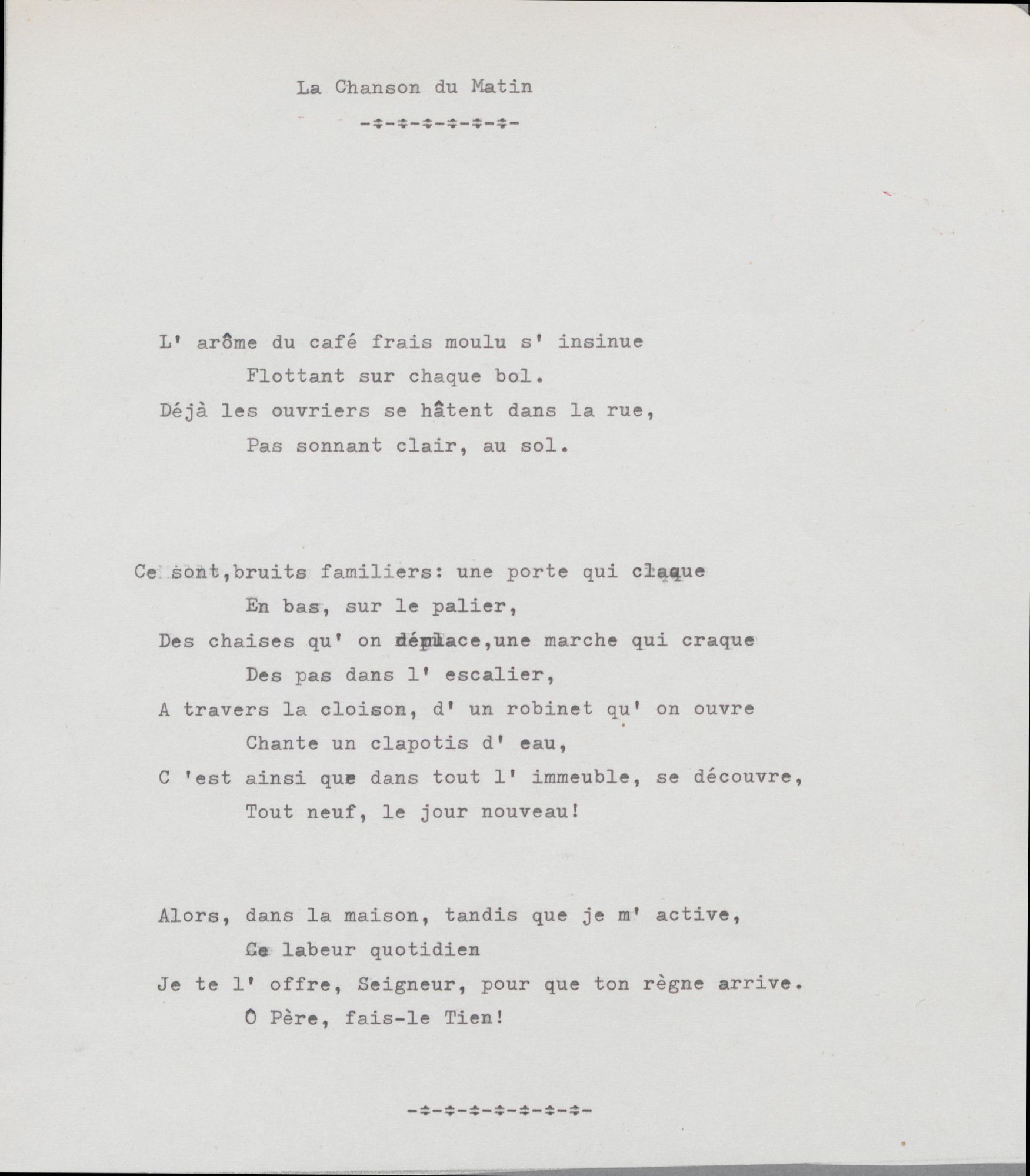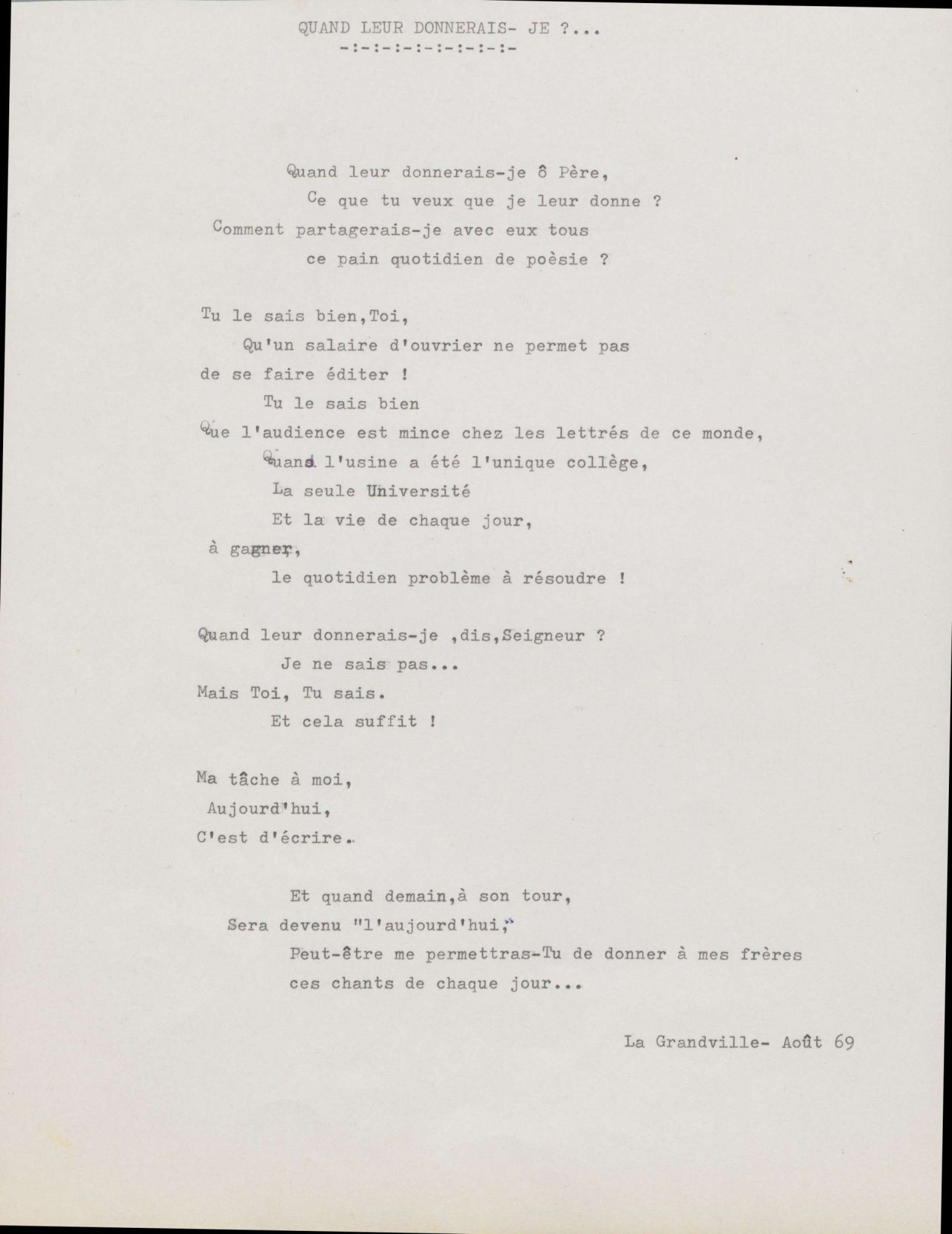 D’autres sont plus personnels. La foi est ainsi présente dans ses poèmes (Lorsque, Entre nous Marie, Kyrie eleison, Vous n’aurez pas de signe). La mort de sa fille Odile, à l’âge de 6 ans, est évoquée plusieurs fois (Le temps des semailles, Credo ! et le poignant Ce jour-là). Certains poèmes sont dédiés à ses enfants (Si…) ou à ses petits-enfants (Tout petit, A François).