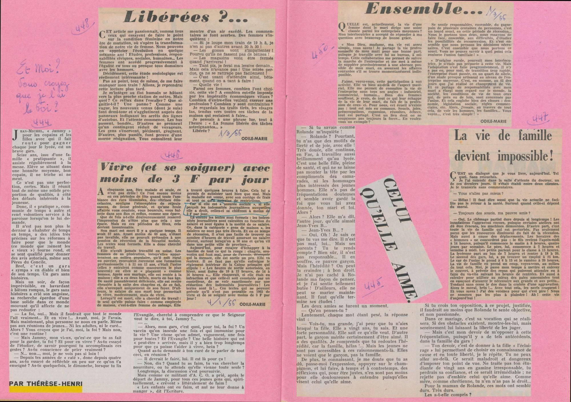 L’intérêt de ce fonds est inversement proportionnel à sa taille (une boîte). Tout d’abord, plus de 1500 articles sont conservés, rendant possible l’étude exhaustive de ce témoignage de la vie ouvrière. A partir de conversations, de courriers reçus et de choses vues et entendues dans sa vie quotidienne, Marie-Louise Gillet réalise un travail de journaliste, de sociologue, de psychologue. Mais aussi, dans le contexte de l’après-guerre, d’éducateur et de militant. Grâce à sa grande expérience de la vie et de la condition ouvrière, elle analyse avec justesse ces situations du quotidien pour en faire apparaître le sens, pour en tirer un enseignement et souvent faire un lien vers la foi (la Jeunesse Ouvrière Catholique Féminine l’a fortement influencée).