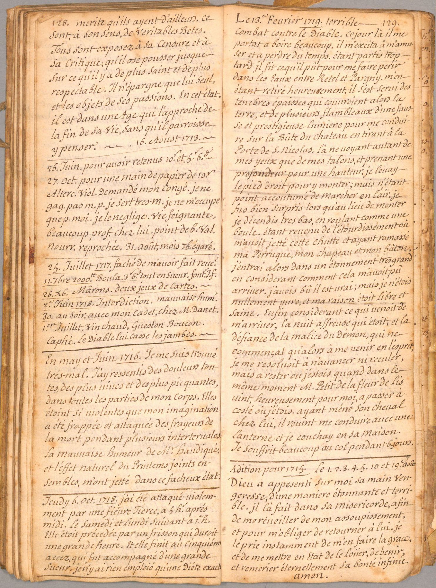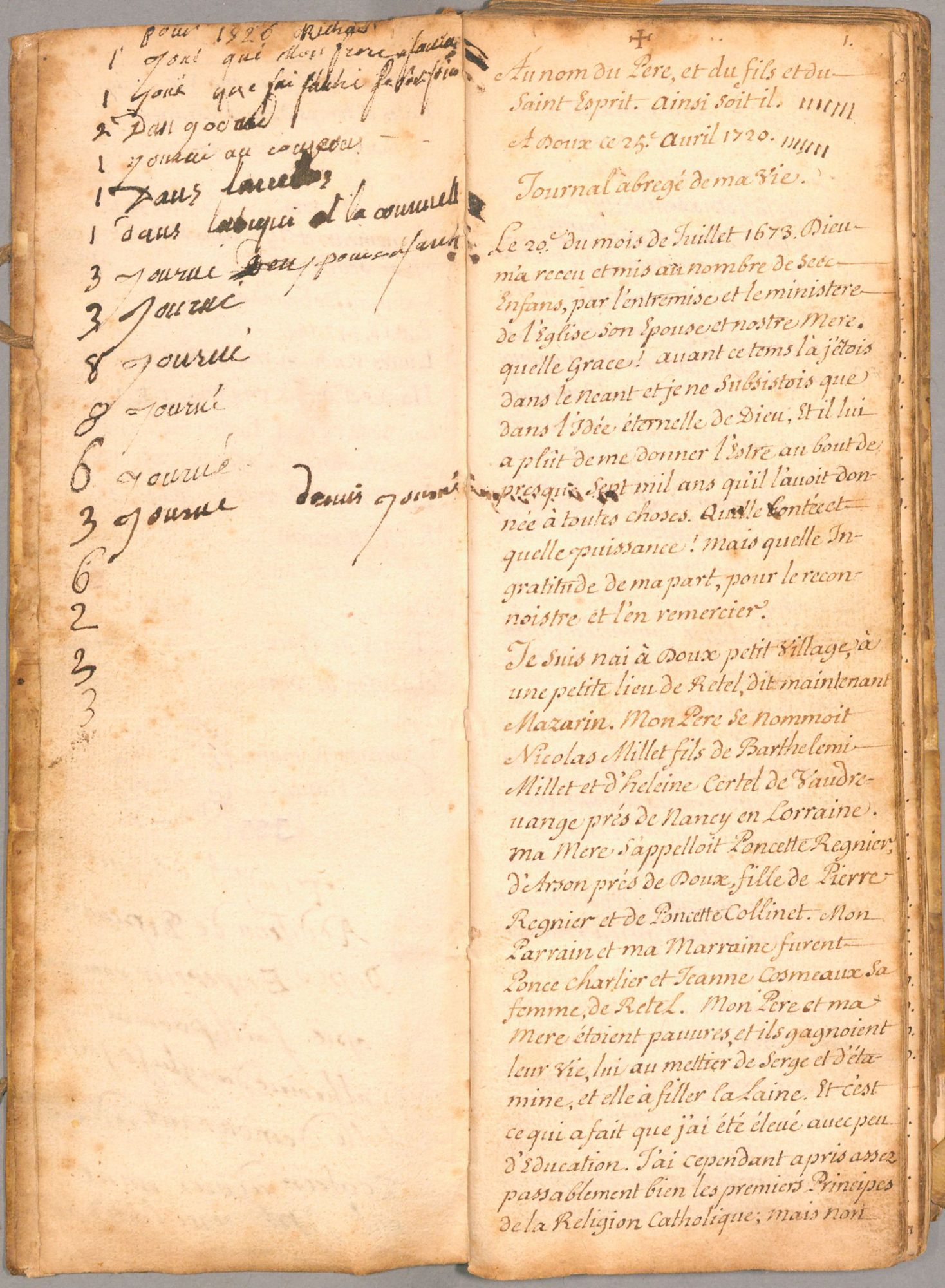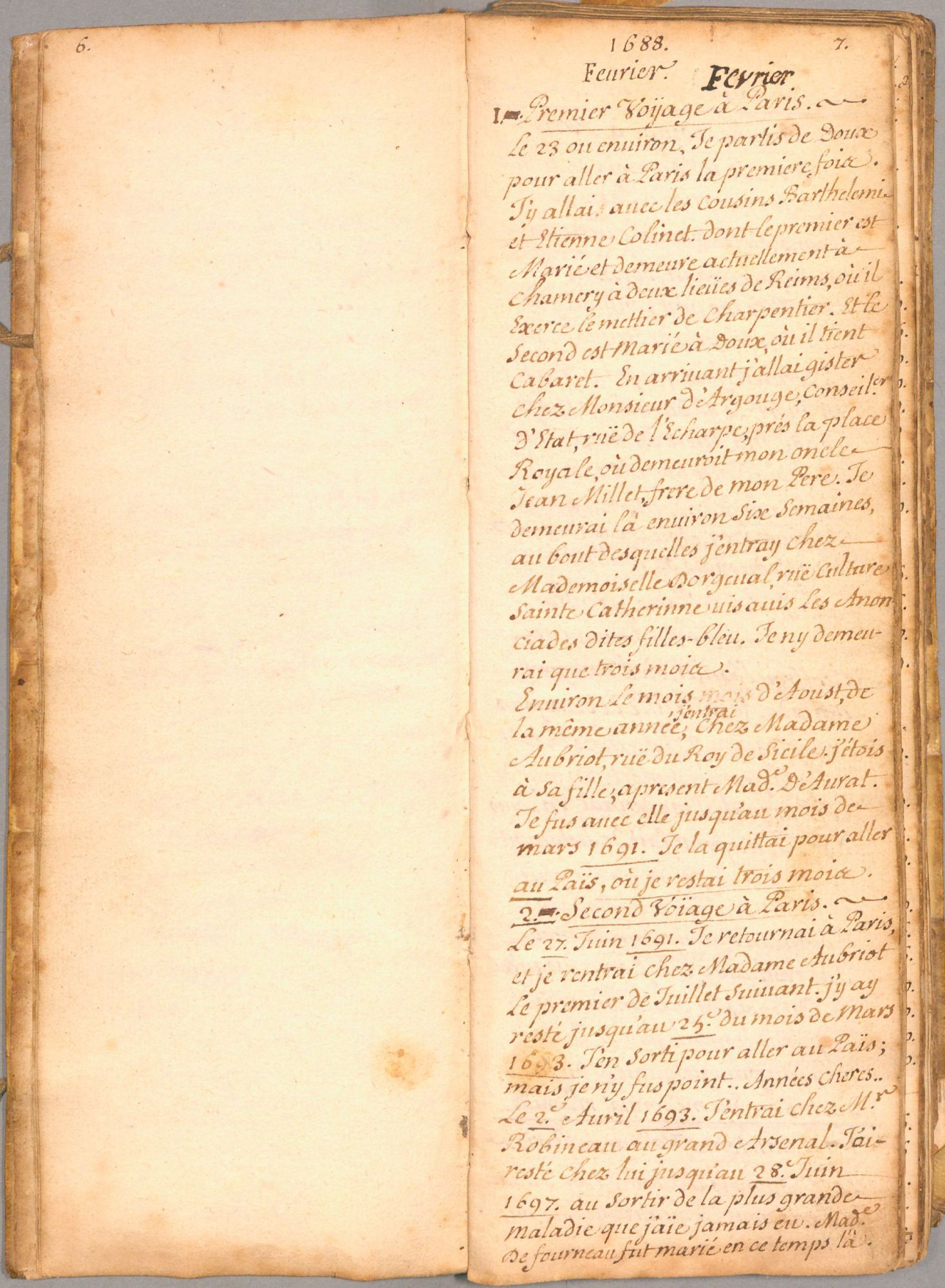 À 15 ans, en 1688, il effectue un voyage à Paris où il est reçu par son oncle paternel qui l’introduit dans le milieu des conseillers du roi et magistrats de la capitale au service duquel il se met à travailler. Son journal rend compte de ses pérégrinations à travers les rues qu’il cite, des dépenses qu’il fait, des moments de fêtes et de réjouissances, des personnes pour lesquelles il a de la reconnaissance. Il mentionne également quelques noms de personnes originaires de la Champagne septentrionale et installés à Paris.