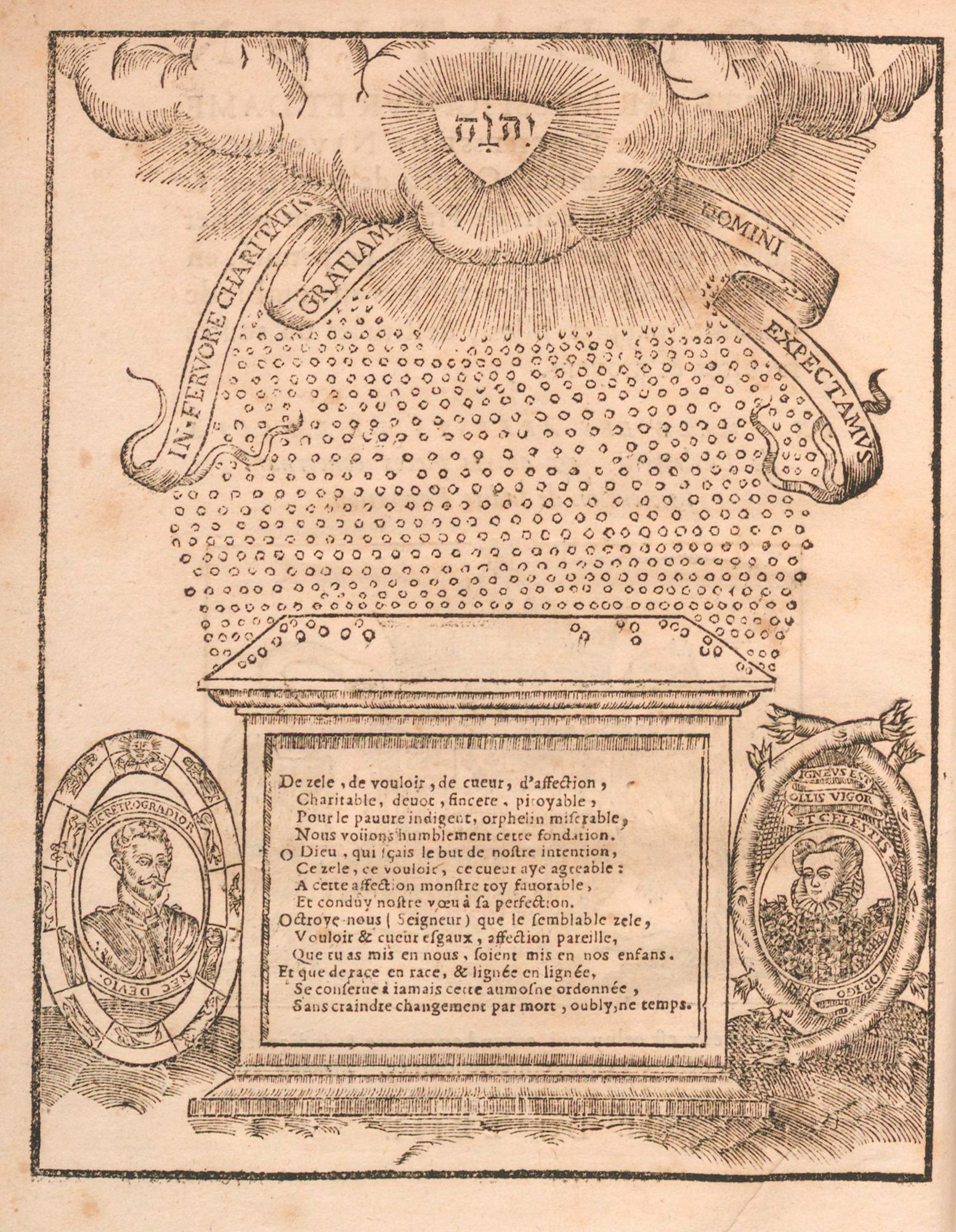 Cet ouvrage a rejoint la bibliothèque des Archives départementales en 2024 grâce à un achat effectué auprès d’un libraire et bouquiniste ardennais. Le document ici présenté est le frontispice du règlement de la fondation des Filles-Madame, imprimé en 1663. Cette gravure peut se lire de haut en bas. En haut, le ciel avec Dieu (écrit en hébreux יהוה « yhwh »). La Trinité est représentée sous forme de coupe d’où s’échappe la manne qui tombe en pluie sur un autel en pierre. Le duc et la duchesse ont leur portrait de part et d’autre de l’autel et soutiennent ce dernier. Leurs actions charitables est gravée sur le devant de l’autel.