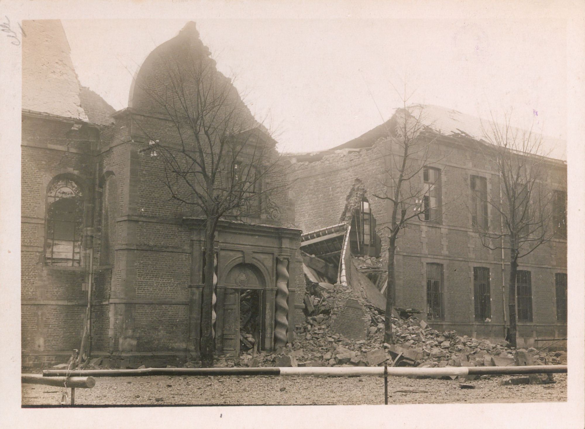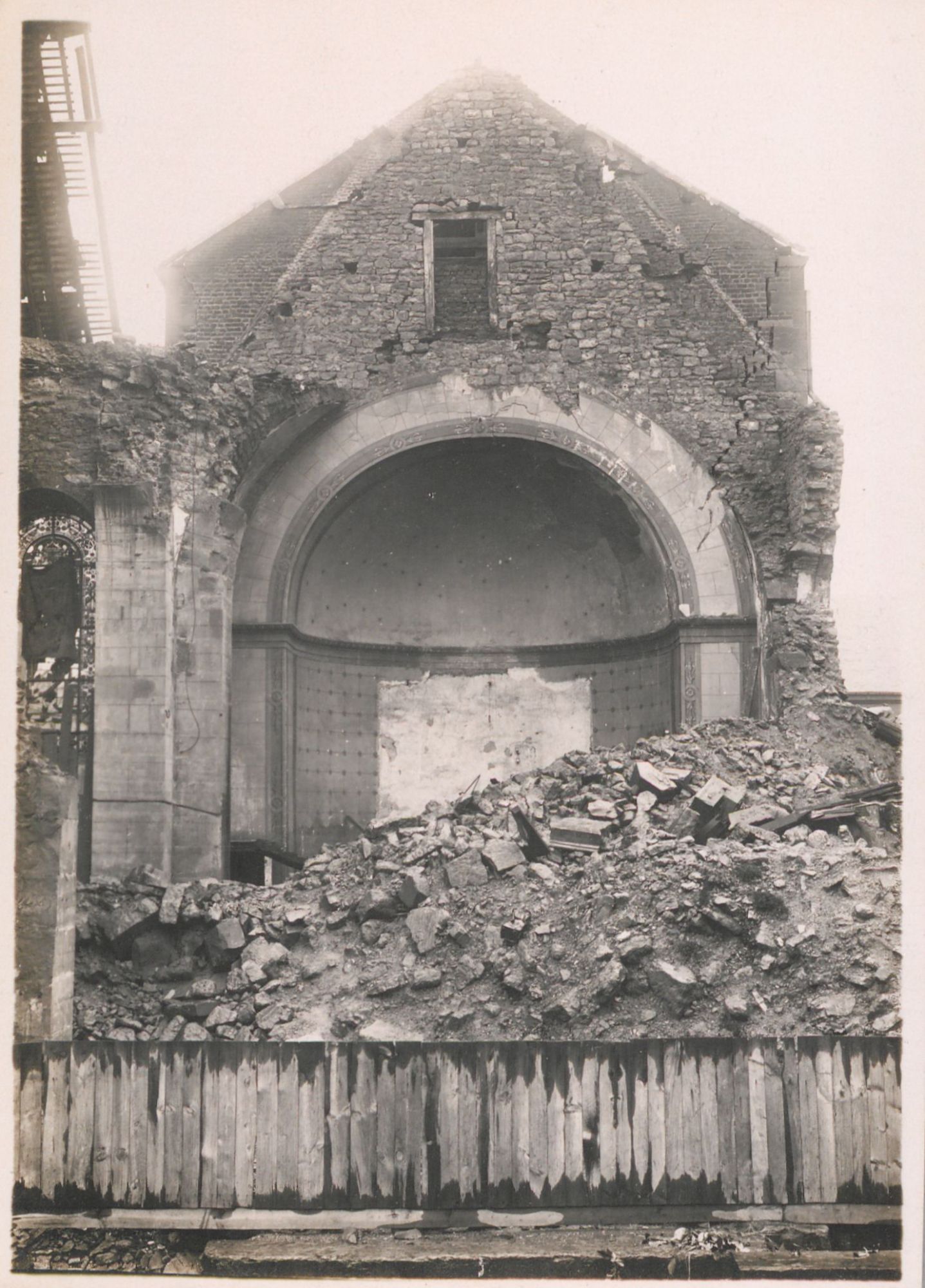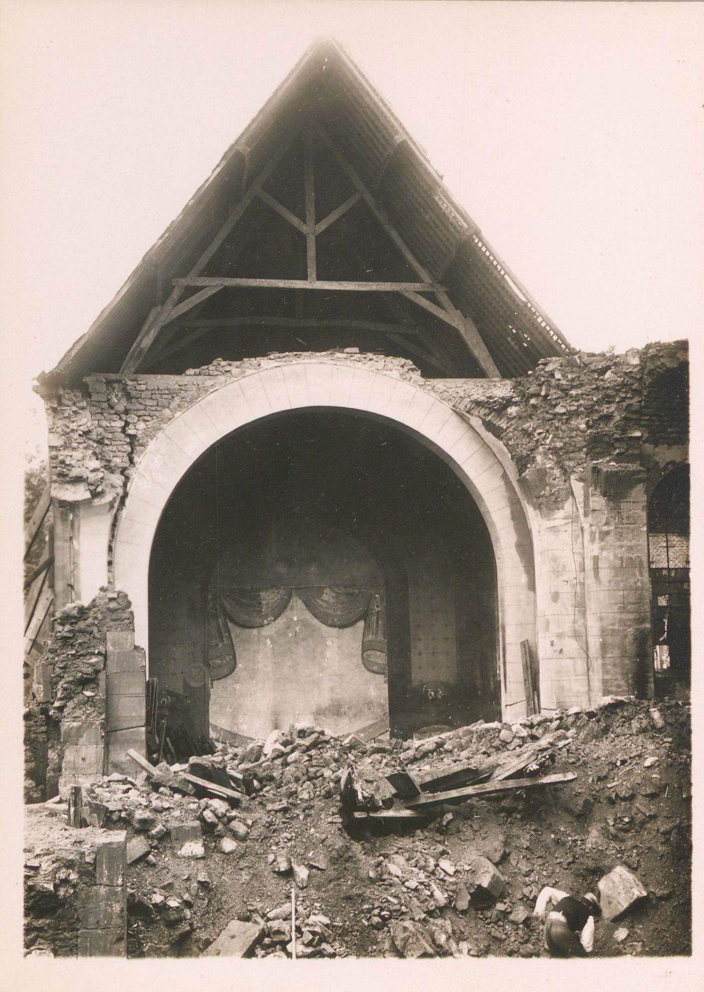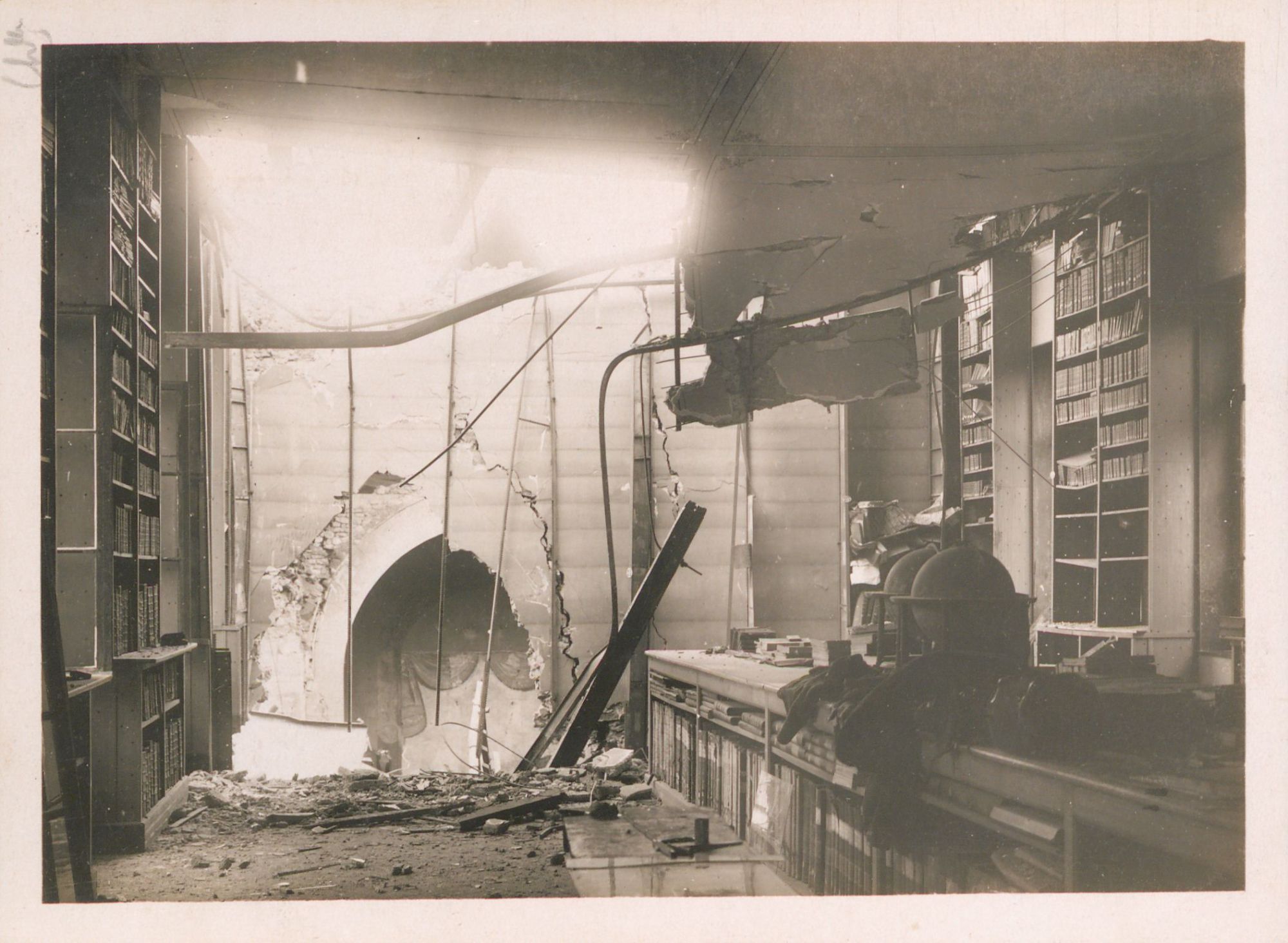 Le clocheton en ciment armé […] dégringolant de ses 25 à 30 mètres de haut, enfonçait la toiture de la bibliothèque, pulvérisait tout le premier étage et le tout « descendait », moellons de mur, toiture, charpente, plancher, bouquins au rez-de-chaussée.