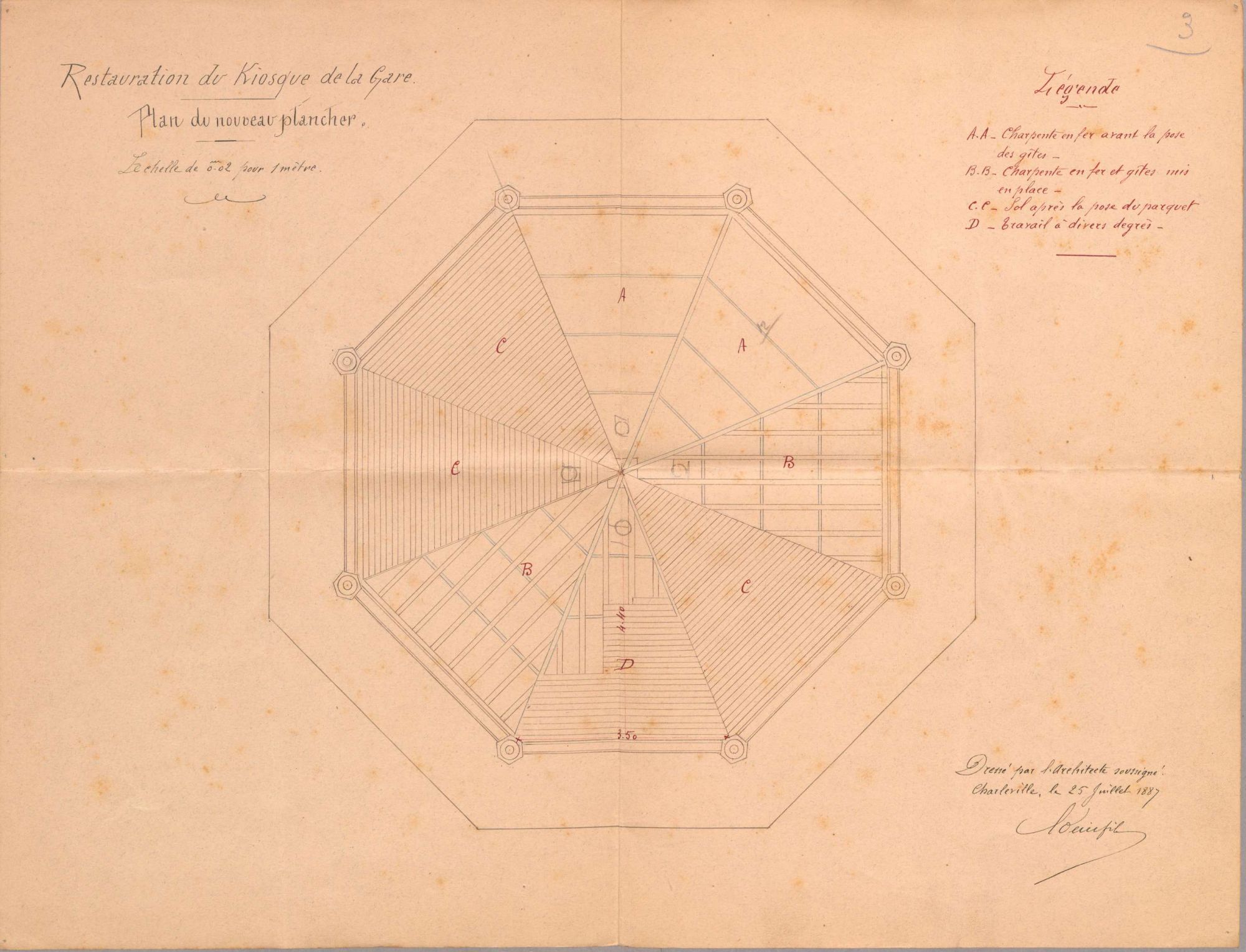 La première série de plans est établie suite à la délibération du 9 juillet 1878 par laquelle la ville de Charleville décide la construction d’« un kiosque pour abriter les musiciens sur la place de la gare ». Les travaux de construction sont confiés pour la base à M. Stévenot, entrepreneur à Charleville, et pour la partie supérieure à M. Godart, maître serrurier à Charleville, et s’achèvent en juillet 1879.