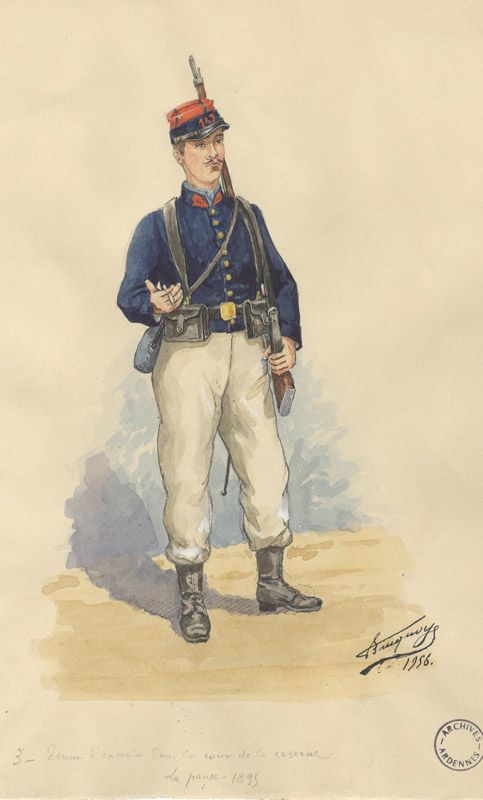 Soldat du 147e régiment d'infanterie (1895) Planche 7 Les soldats portent rarement la grande tenue. La veste de l’Ancien Régime, tout en disparaissant de la grande tenue depuis 1813, reste le vêtement le plus courant des hommes de troupes. Elle est portée ici avec un pantalon de treillis blanc