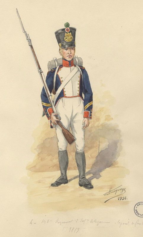 Ce régiment est créé de toutes pièces par Napoléon au retour de la campagne de Russie. Ce caporal de fusiliers porte les galons de grade jaune-aurore qui ont servi pendant tout l’Empire. La grande nouveauté de cet uniforme est l’habit veste descendant sur l’estomac. Ce régiment est quasiment détruit à la bataille de Goldberg en 1813 et le numéro 147 disparaît jusqu’en 1887.