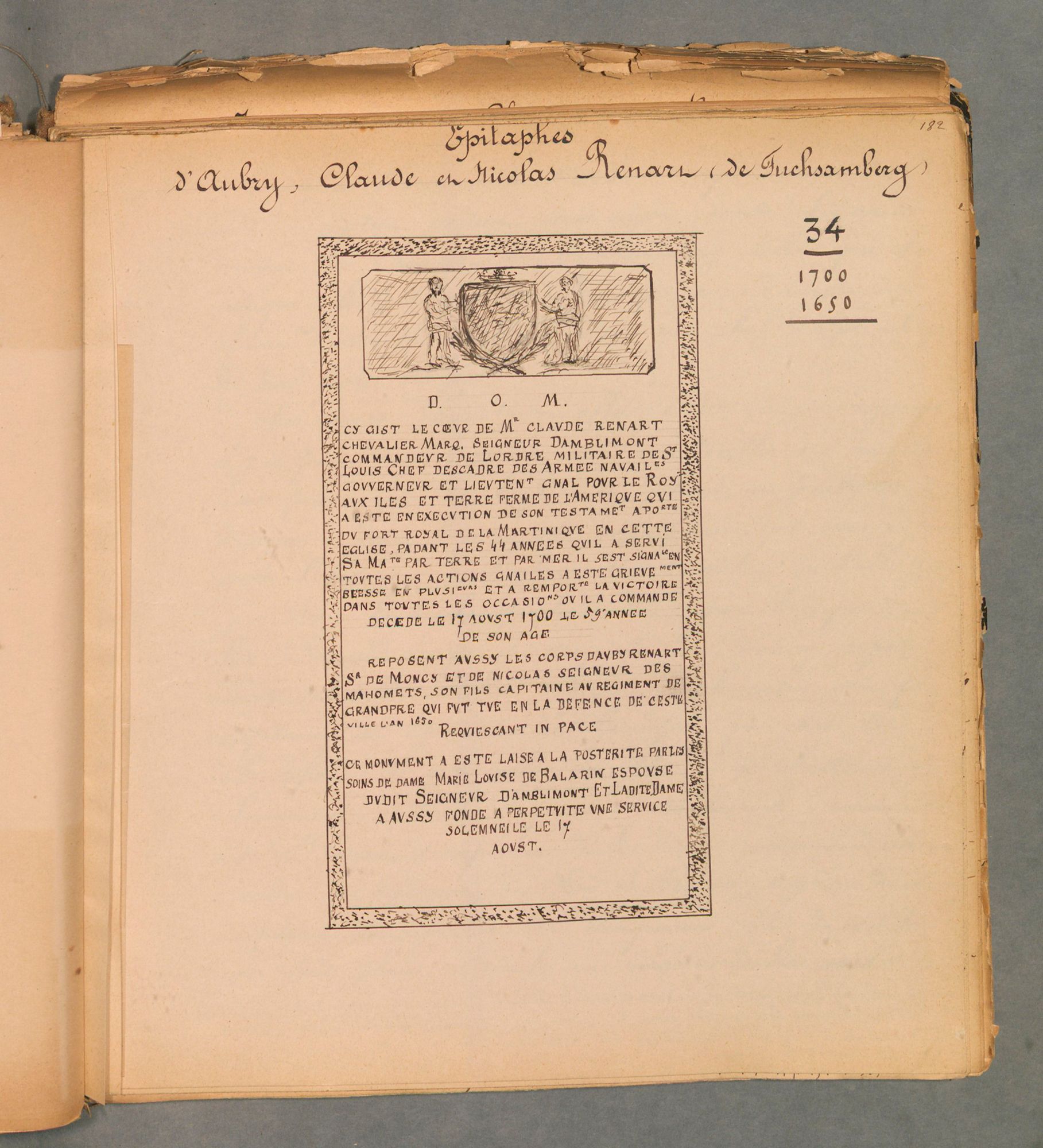 Dans ce manuscrit, l’abbé Frézet a réuni les Inscriptions mouzonnaises, soit 70 textes épigraphiques concernant des personnages de Mouzon ou ayant trait à des évènements locaux. Les plus anciens datent des XIe et XIIIe siècles. L’abbé Frézet a reconstitué des textes alors encore inexactement publiés en s’aidant des notes de M. Poullet et des estampes de M. Numa Albot. Il a également réalisé des recherches aux Archives départementales et nationales ainsi que dans les registres paroissiaux. Ses reproductions sont accompagnées de notes historiques. Près de 270 pages écrites composent ce manuscrit. À cela s’ajoute diverses notes et feuilles volantes. Les inscriptions et autres épitaphes sont dessinées. Une table des matières et une table des noms de lieux et de personnes complètent le manuscrit dans ces dernières pages.