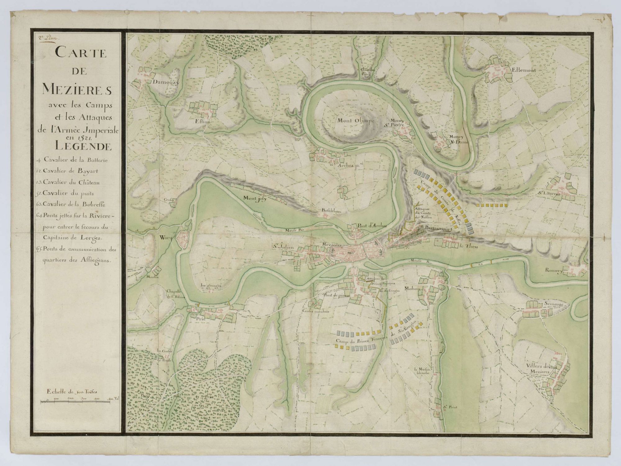 Le plan n’est pas daté mais a été réalisé probablement au début du XVIIIe siècle, à des fins historiques. On y voit les positions des armées de Charles Quint et leurs mouvements vers la ville (lignes jaunes). Les forces impériales sont composées de deux armées : celle du prince de Nassau composé de Flamands à l’est de Mézières et celle de Sickingen composée d’Allemands au sud près de Mohon.