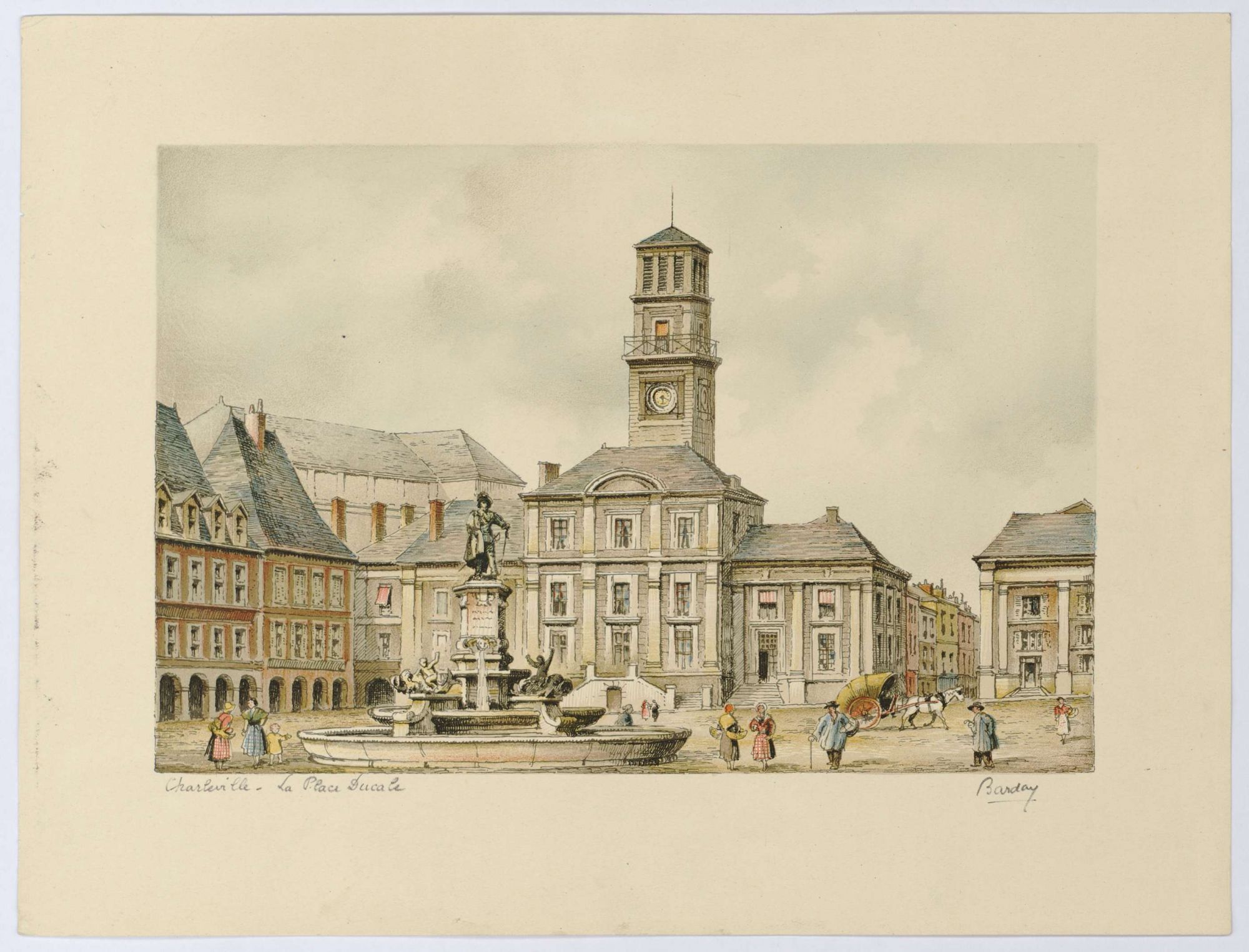 Cette lithographie représentant la fontaine au centre de la place ducale est signée Barday, pseudonyme de Georges Dayez (1907-1991). Ce pseudonyme est créé par le contraction des noms des éditeurs de cartes postales Barré et Dayez.