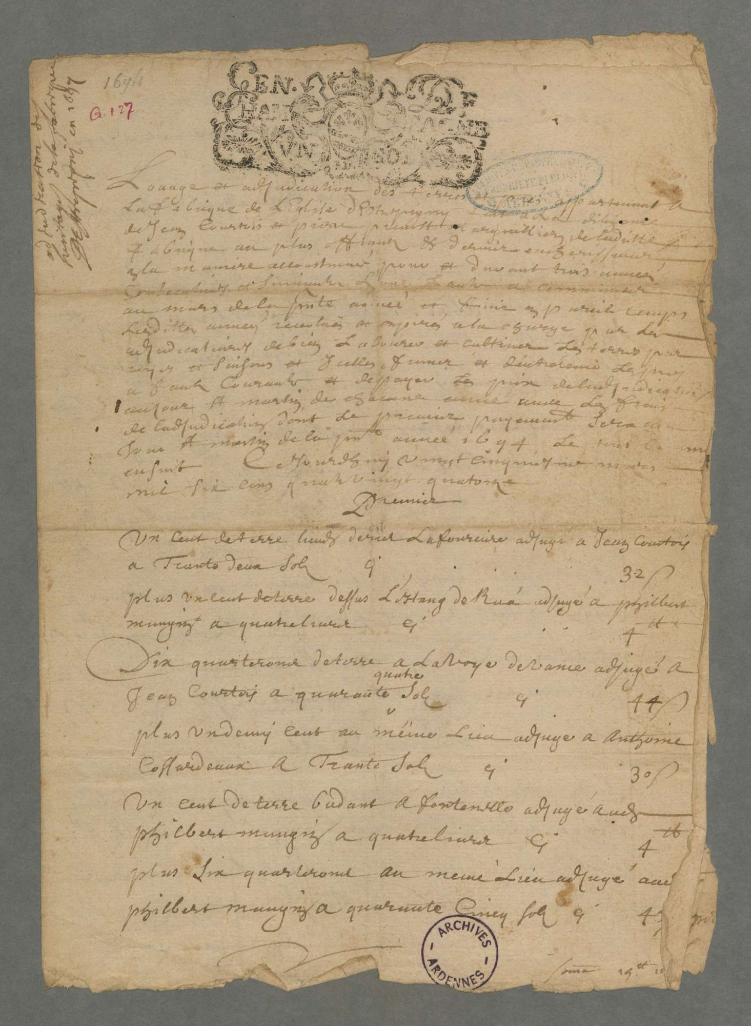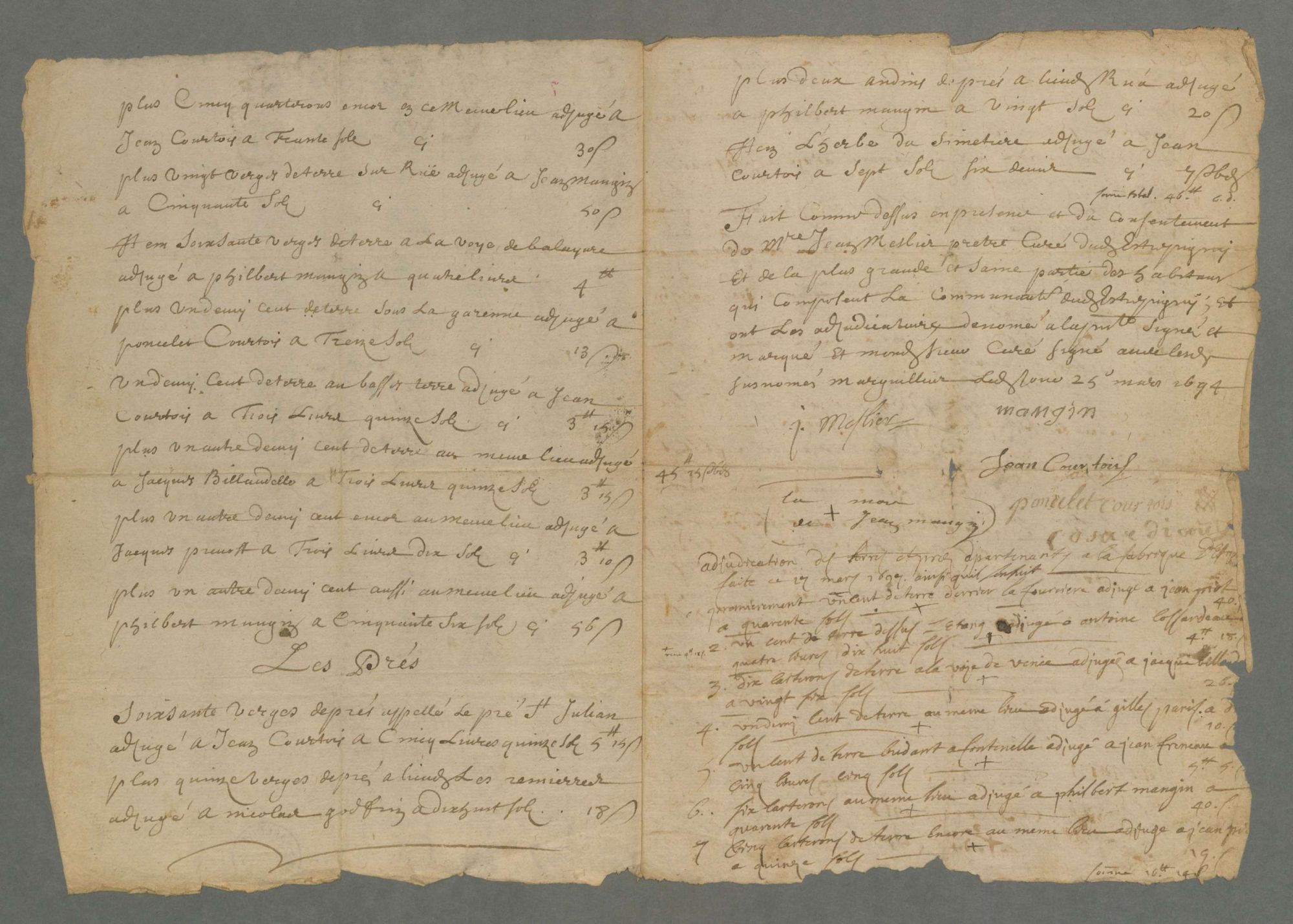 La signature du curé Meslier se retrouve également dans la série G sur l’adjudication des héritages de la fabrique de Balaives (G 95) et dans une adjudication à loyer à Étrépigny (G 127).
