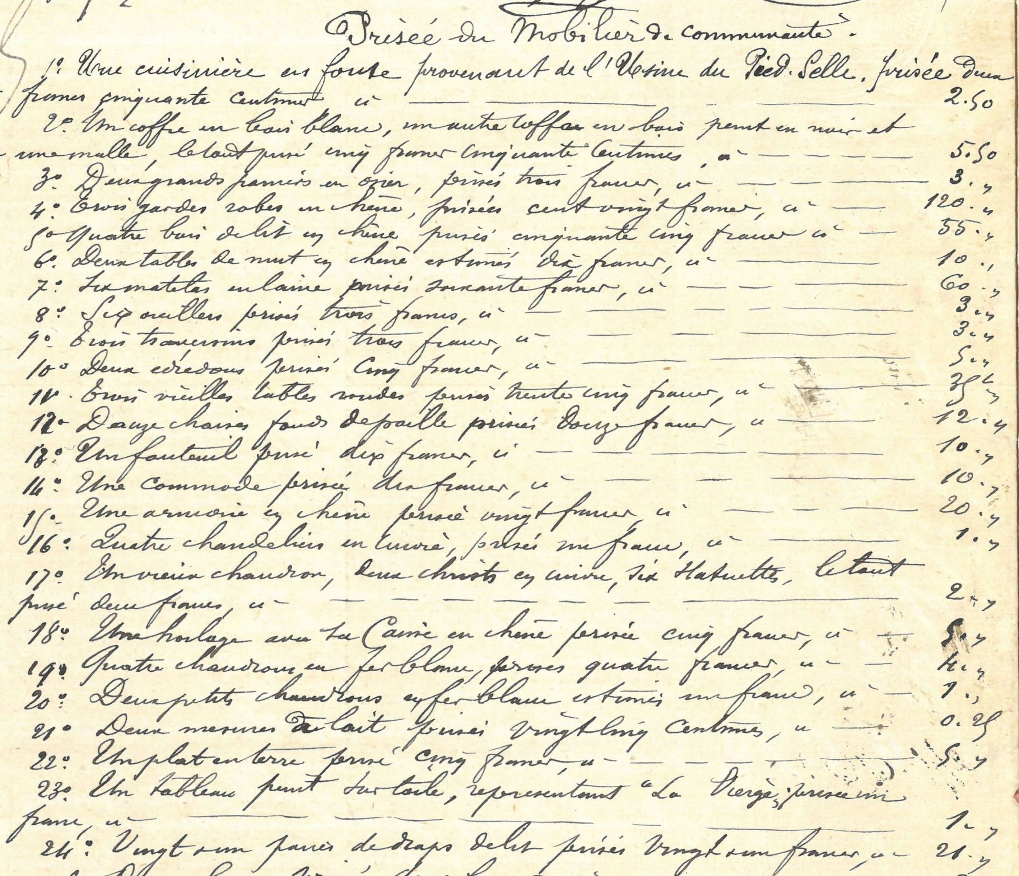 La minute présentée est un inventaire après le décès de M. et Mme Maquenne-Rofidal, document rédigé le 28 janvier 1899 par l’étude de Maître Terrien, notaire à Fumay. La minutie avec laquelle est rédigé cet inventaire permet d’appréhender les biens possédés par le couple défunt. On y dénombre par exemple une cuisinière en fonte provenant de l’usine du Pied-Selle, trois garde-robes en chêne, quatre bois de lit, six matelas en laine, un fauteuil, une commode, quatre chandeliers en cuivre, une horloge avec sa caisse en chêne, un tableau peint sur toile représentant la Vierge ou encore trente taies d’oreillers. On y mentionne également les sommes contenues sur les comptes bancaires ainsi que les animaux de l’écurie, un cheval, une vache et une vache à lait, ou encore diverses pièces de terre. Les dispositions testamentaires permettent de connaître la répartition des biens entre les différents héritiers.