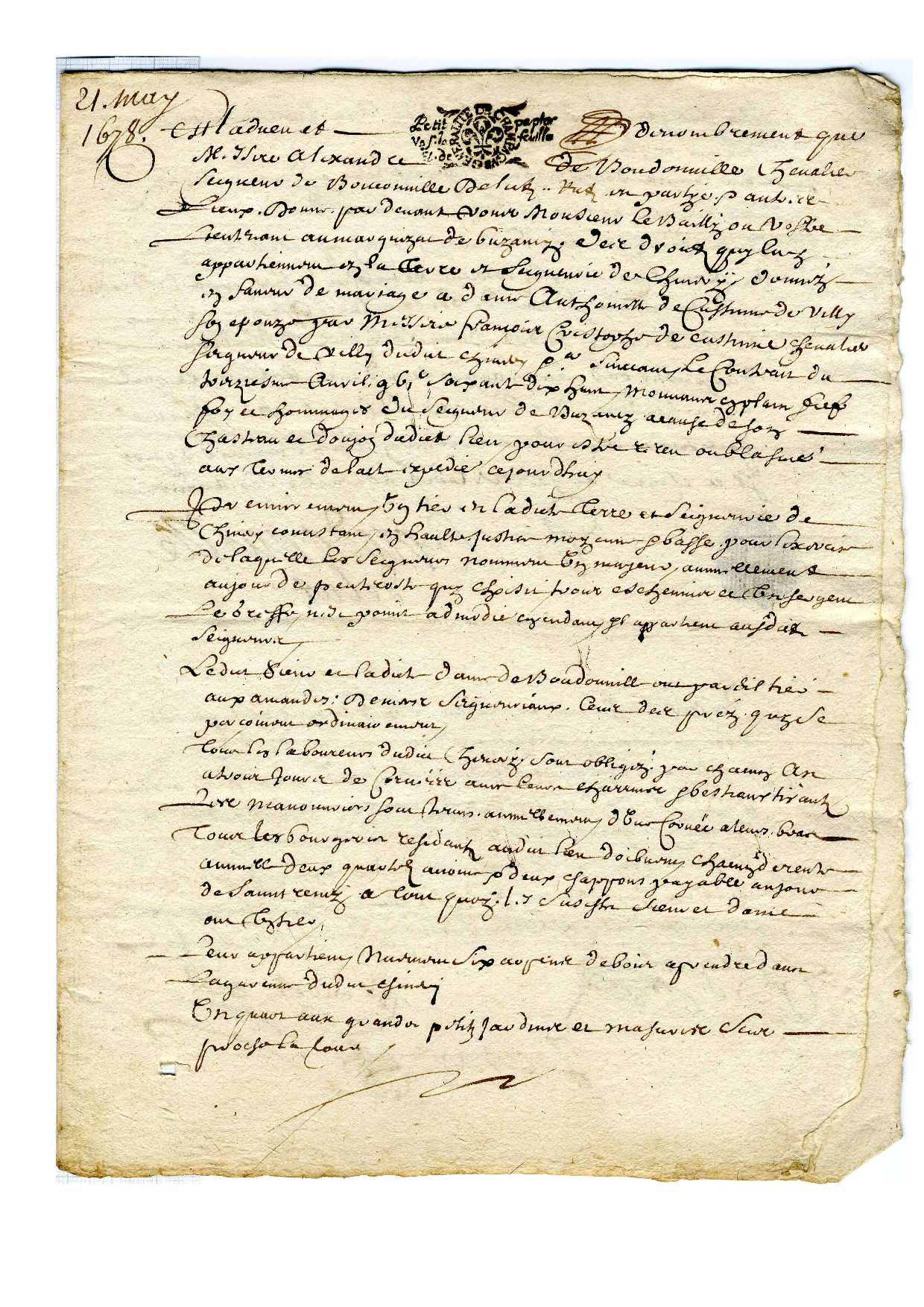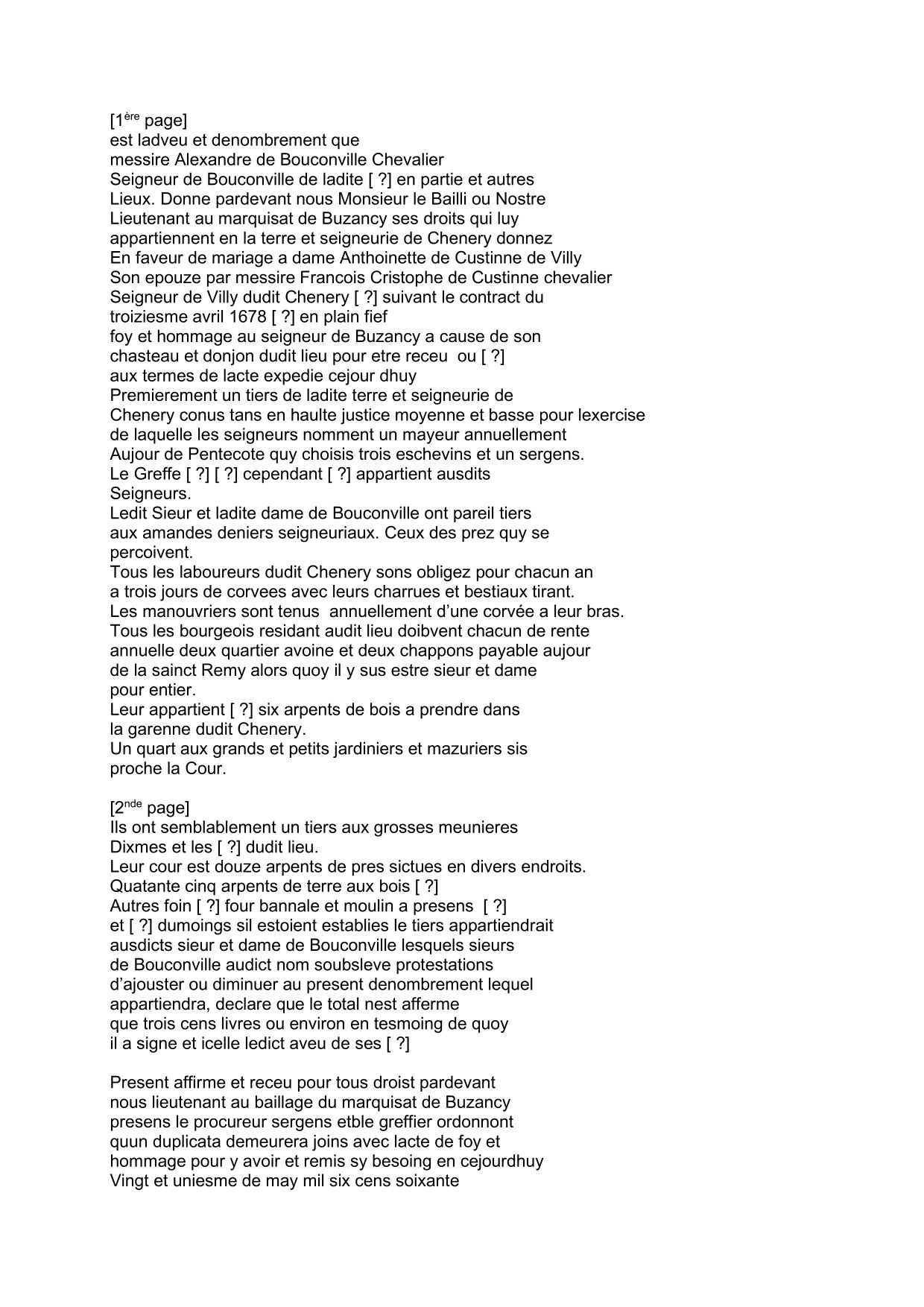 Ici, le sieur de Bouconville prête hommage au seigneur de Buzancy pour ses terres de Chennery . L’acte nous renseigne sur la hiérarchie et les institutions féodales qui structurent le territoire argonnais à l’époque moderne.