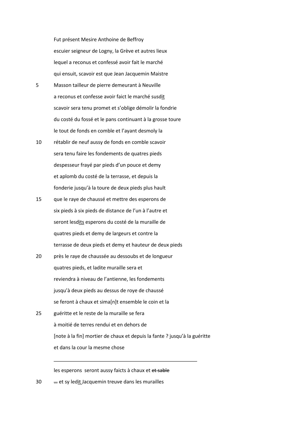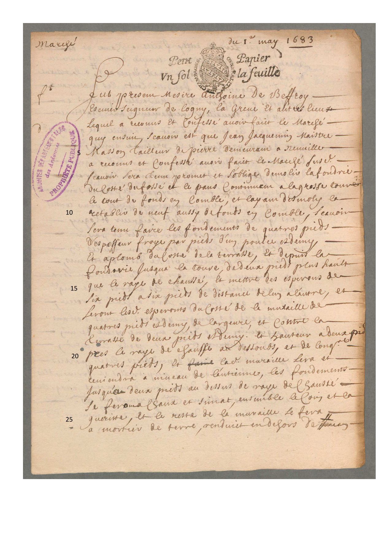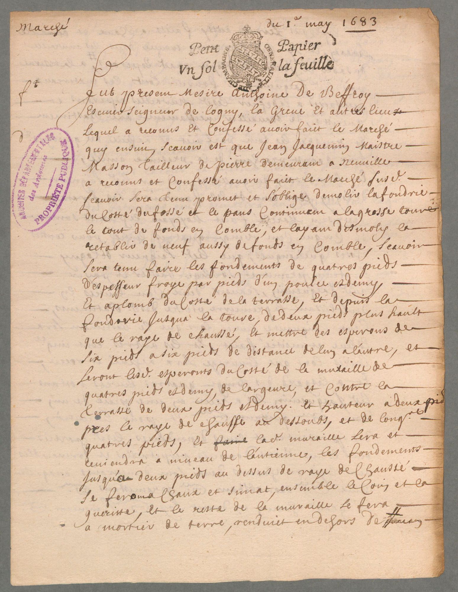 Marché de travaux passé par Antoine de Beffroy, seigneur de Logny, La Grève et autres lieux, pour des travaux à son château, 1683