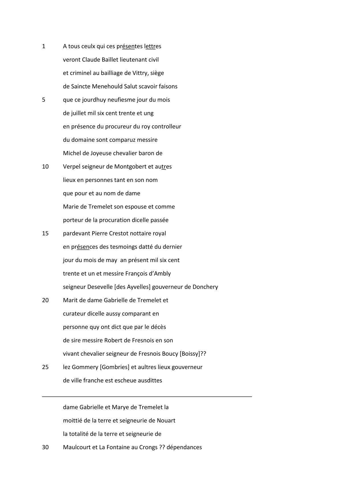 Foi et hommage rendus par Michel de Joyeuse, baron de Verpel en son nom et au nom de Marie de Trémelet, son épouse, et François d'Ambly en son nom et au nom de Gabrielle de Trémelet, son épouse pour la moitié de la terre de Nouart échue à Marie et Gabrielle par le décès de Robert de Trémelet.