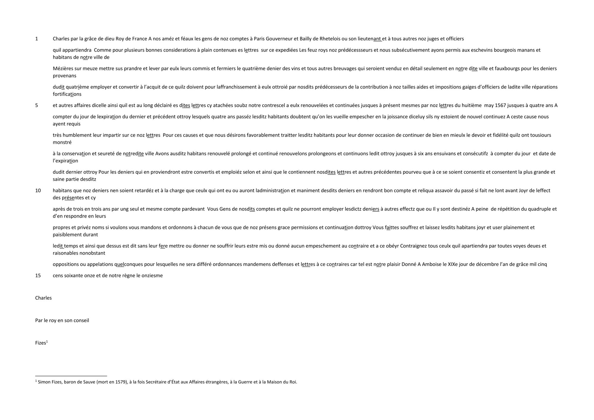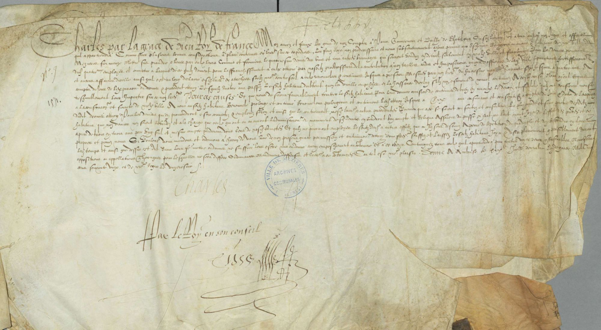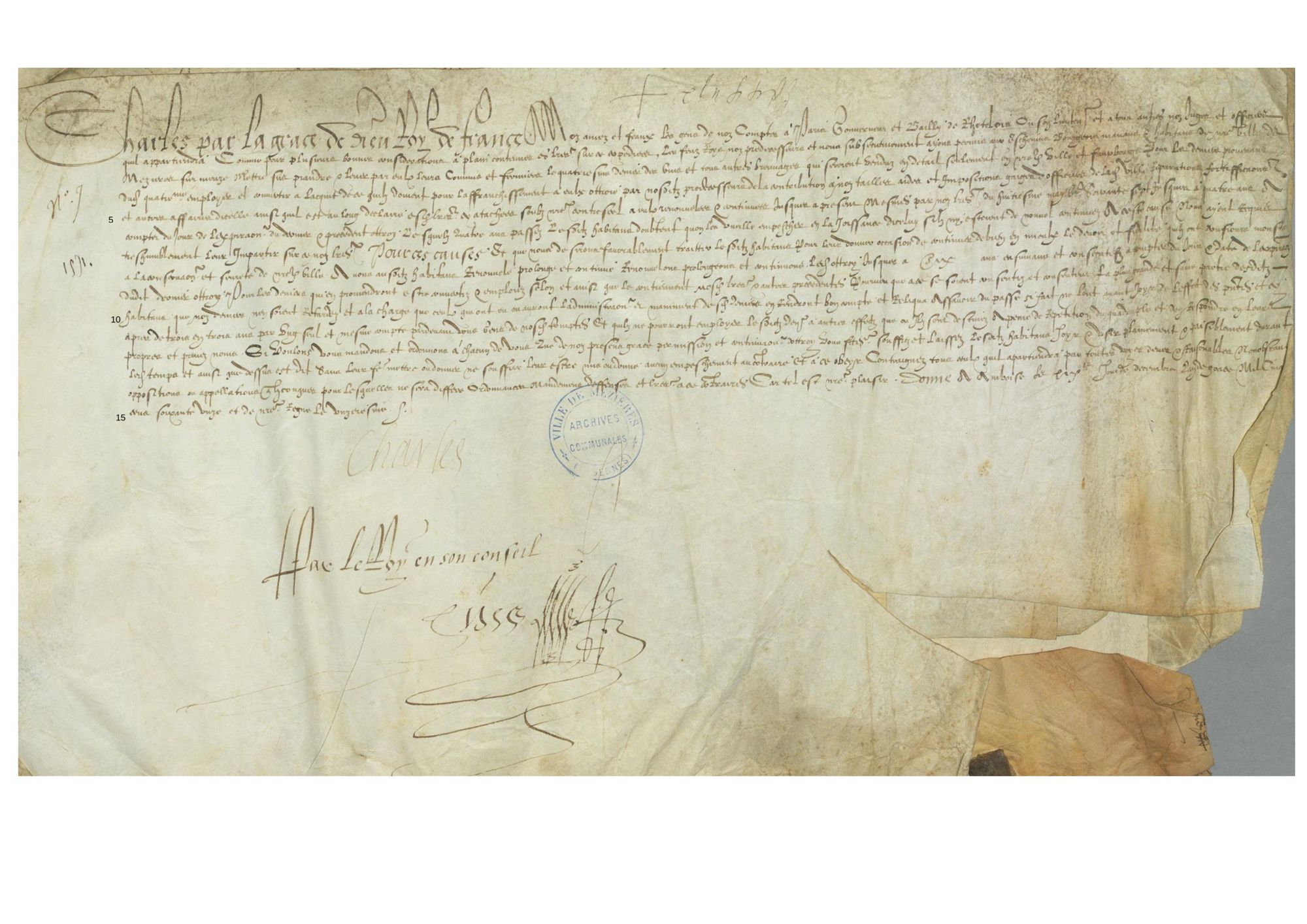 Lettres patentes de Charles IX du 19 décembre 1571 prolongeant l’exemption du payement de la taille par les habitants de Mézières pour six années supplémentaires