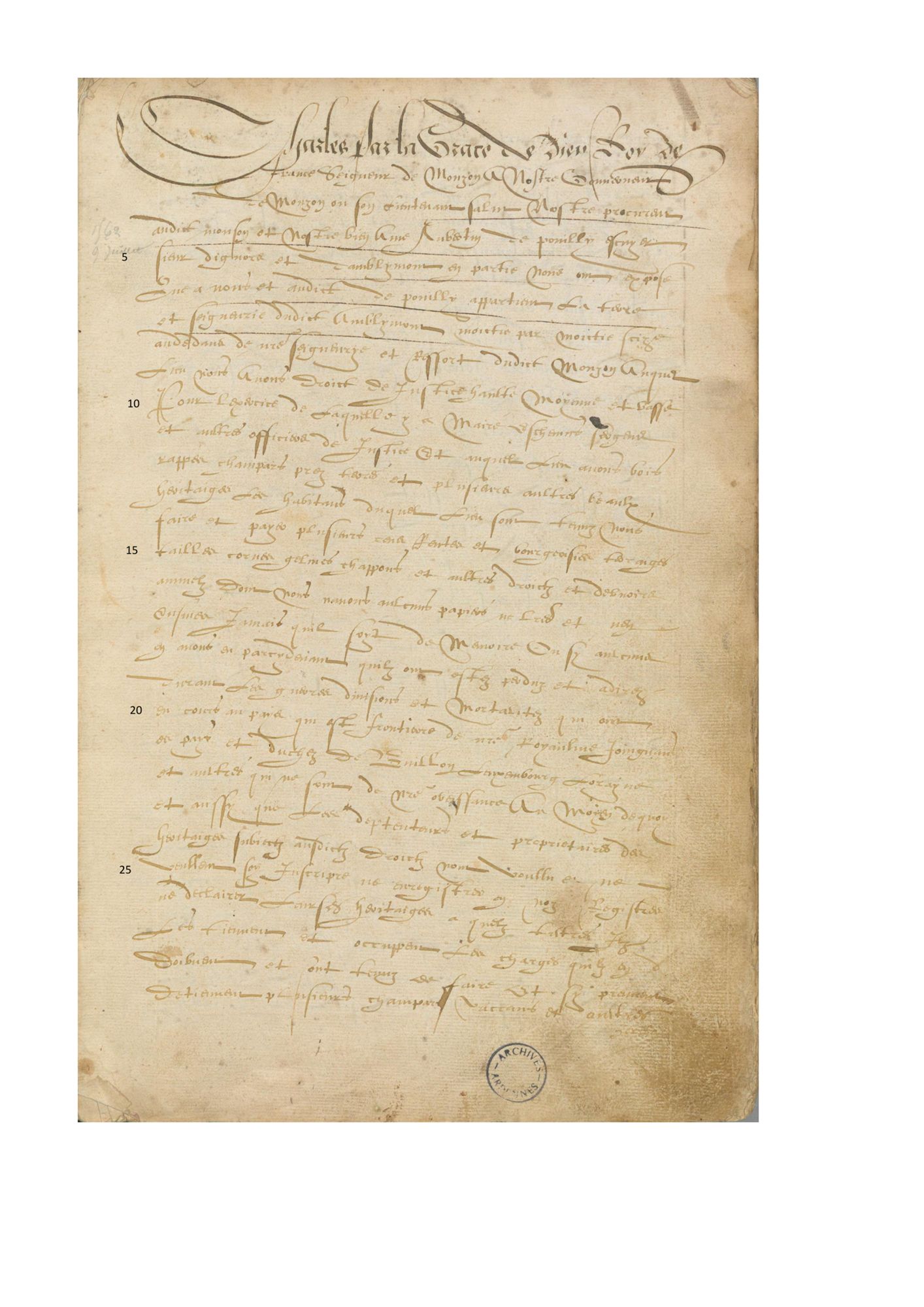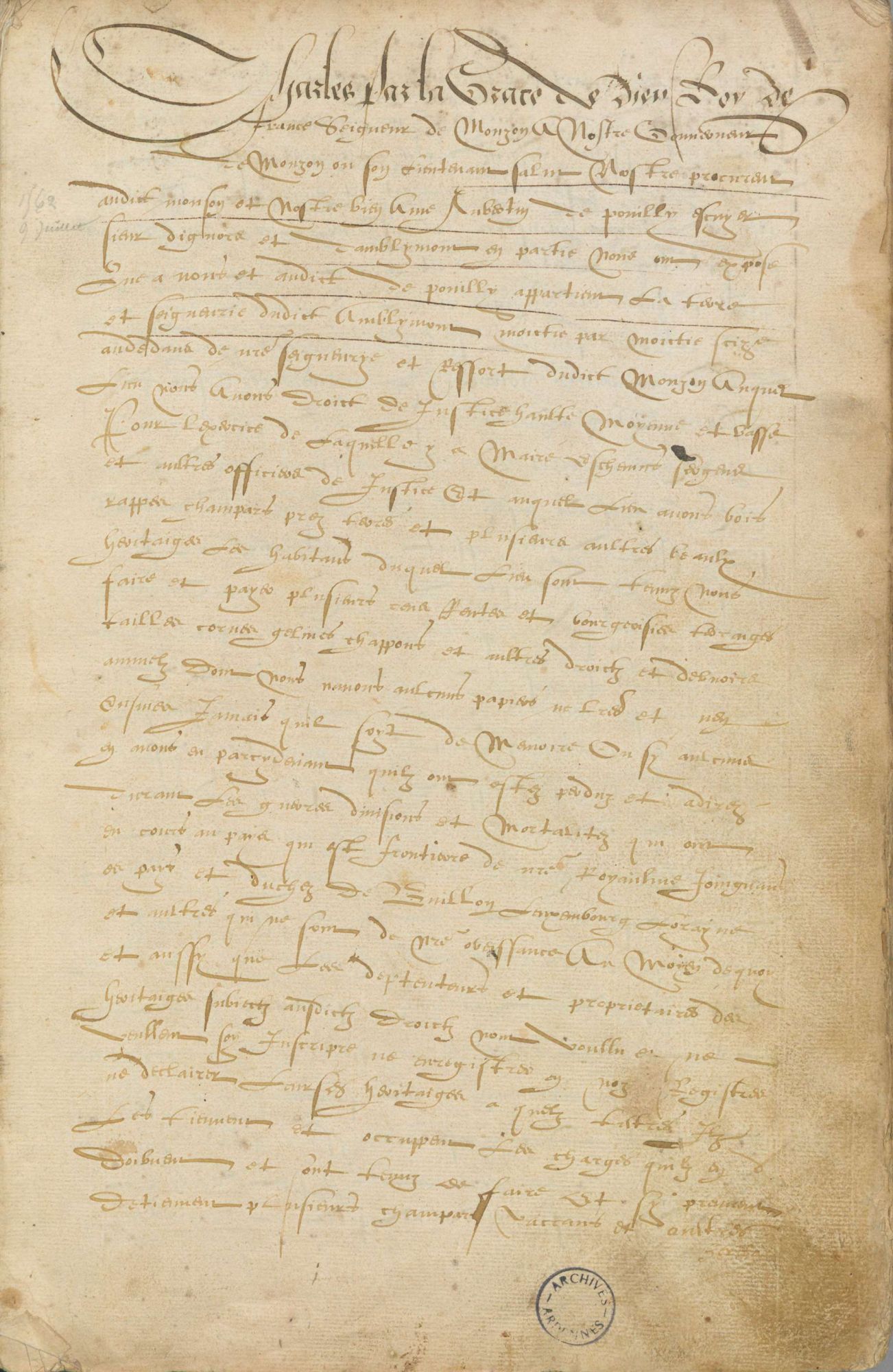 Leur authenticité est assurée par une lettre-terrier du roi, délivrée par la grande ou par une petite chancellerie, qui autorise la réécriture du terrier avant d’être enregistrée par le juge le plus proche et affichée dans un lieu fréquenté puisque chaque personne doit venir y déclarer ce qu’il tient du seigneur. Ici, c’est Charles IX qui autorise la réécriture du terrier par une lettre qui est transcrite en début de registre afin d’affirmer le droit qu’a le seigneur, Aubertin de Pouilly, de le faire. La seigneurie d’Amblimont relève de la suzeraineté du seigneur de Mouzon qui n’est autre que le roi de France depuis que Charles V a pris possession, en 1379, de la ville à l’archevêque de Reims pour mieux la fortifier étant donné la situation stratégique à la frontière du royaume. Les habitants viennent déclarer à tour de rôle leurs propriétés : c’est le cas ici d’Henri Colson.