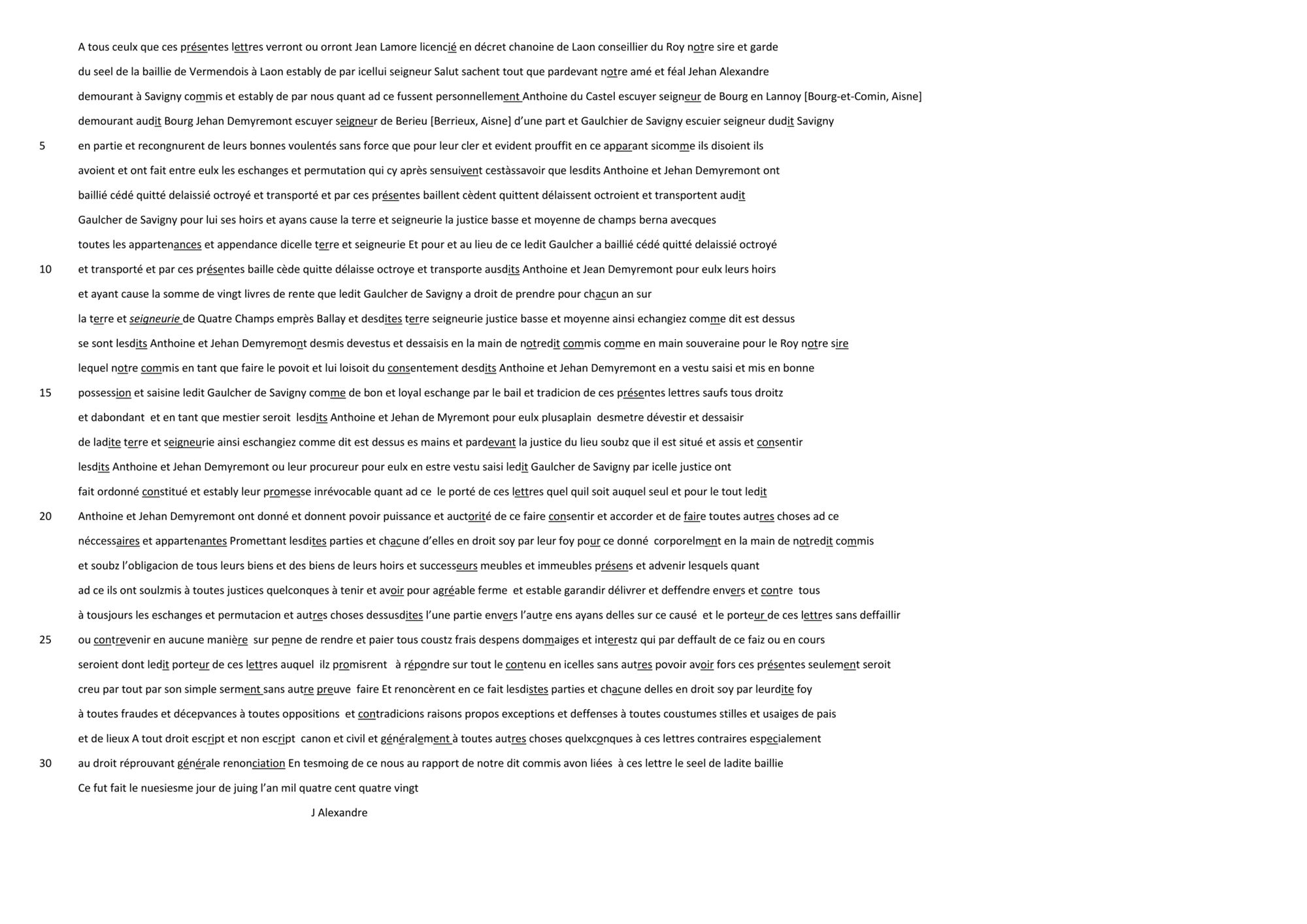 Par cet acte, les deux parties officialisent devant le représentant du garde du scel du bailliage de Vermandois l’accord conclu entre eux. Celui-ci consiste en l’échange par Anthoine du Castel et Jean de Myremont de la seigneurie de Champbernard, située actuellement à Contreuve, contre vingt livres de rente annuelle à prélever sur la seigneurie de Quatre-Champs appartenant à Gaulchier de Savigny.