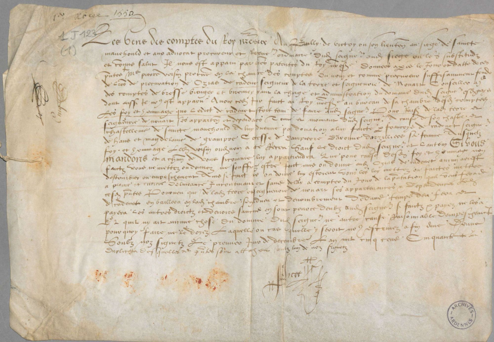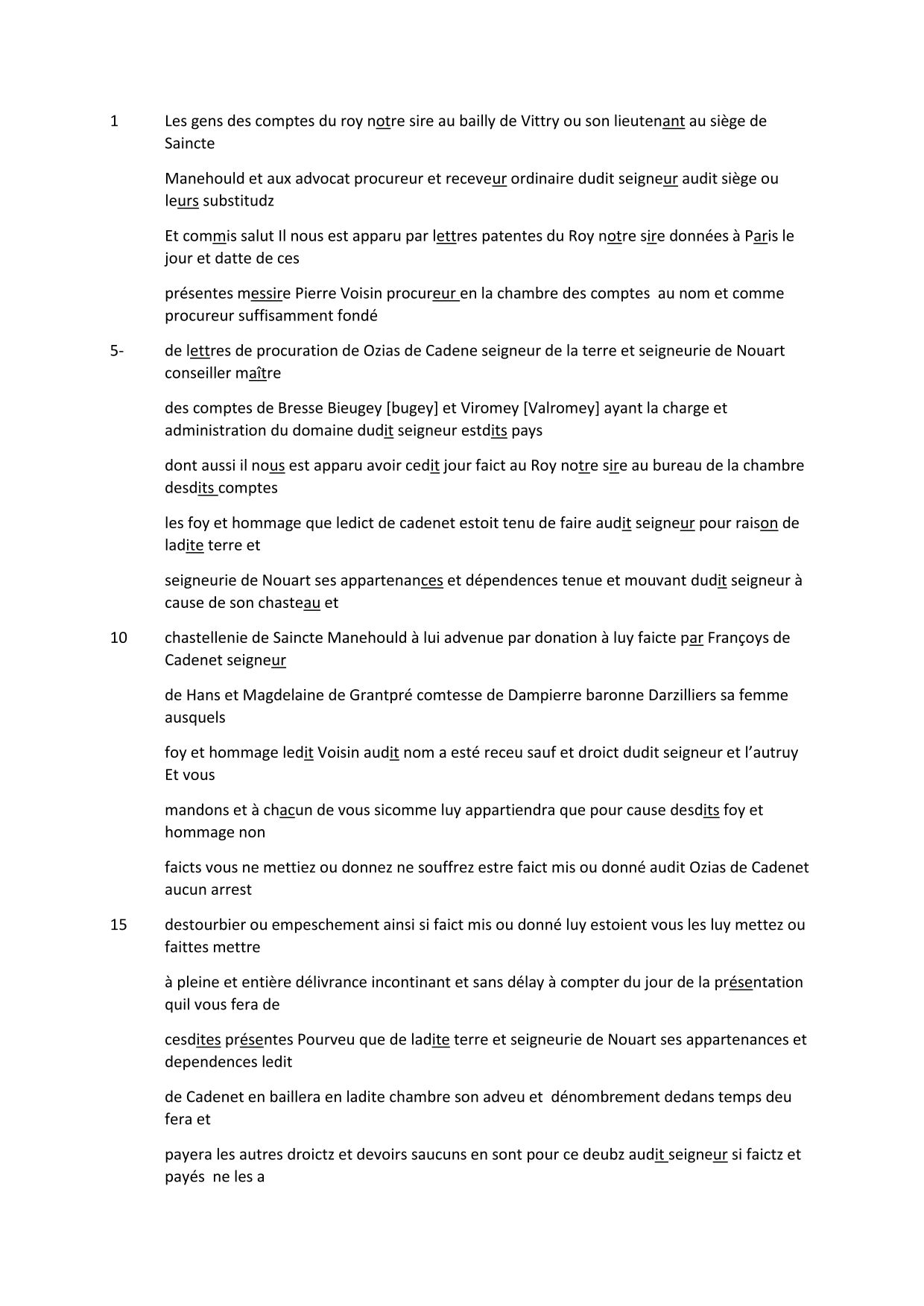 Ce texte est un nouvel exemple d’acte de foi et hommage, cette fois-ci un peu moins d’un siècle avant le précédent acte étudié. Dans ce document, le seigneur de Nouart, Ozias de Cadenet, est aussi présenté comme « maître des comptes de Bresse Bieugey et Viromey ».