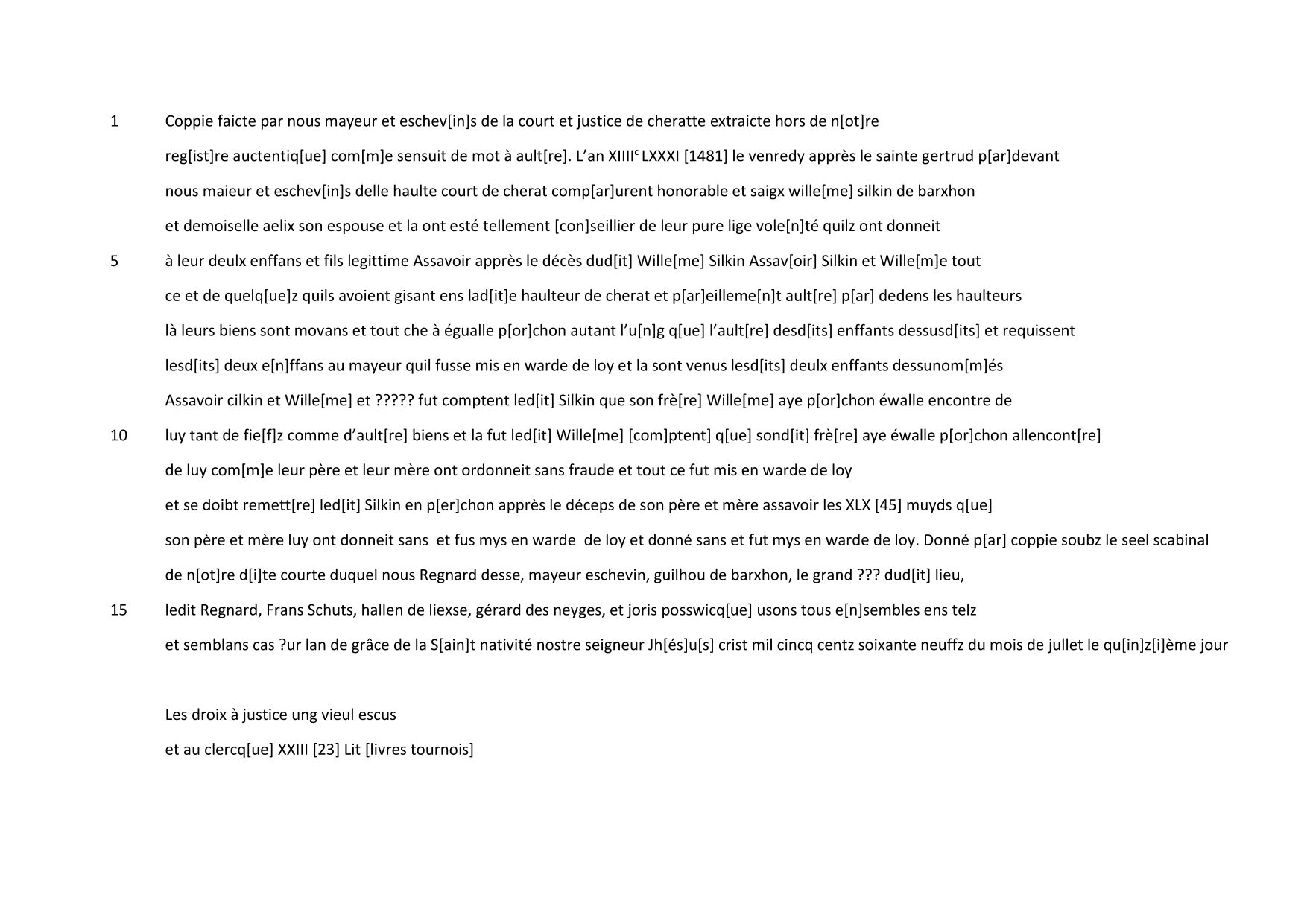 Extrait des registres de la cour de justice de Cheratte relatif à une donation-partage effectuée par Willeme Silkin de Barchon et son épouse Aelix au profit de leurs deux fils Silkin et Willeme.