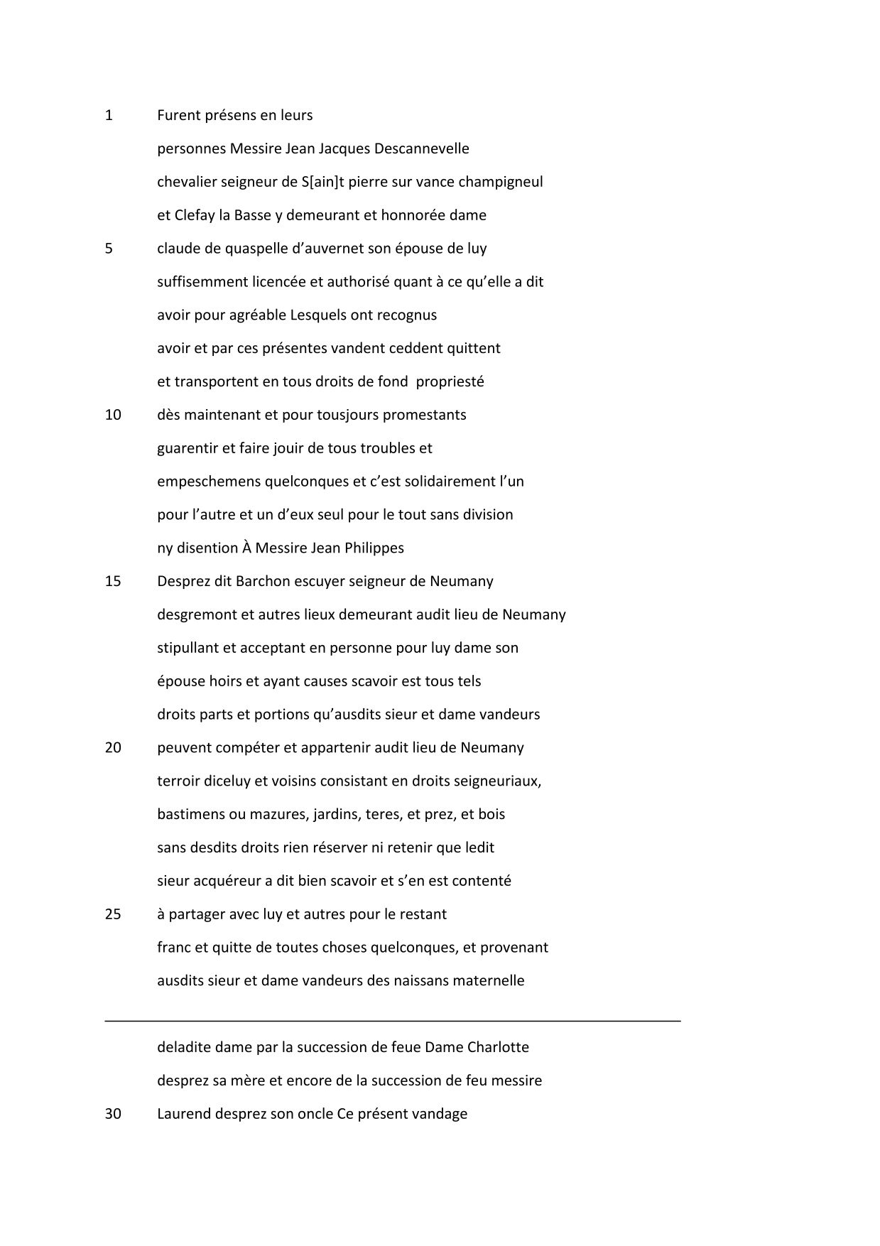 Ce texte illustre les efforts de la famille des Desprez de Barchon pour devenir les seuls seigneurs de Neufmanil. Dans cet acte, Jean Philippe Desprez de Barchon achète sa part de la seigneurie à l’épouse de Jean Jacques Descannevelle, Claude de Quaspelle, héritière de sa mère Charlotte Desprez de Barchon et de son oncle Laurent Desprez de Barchon.