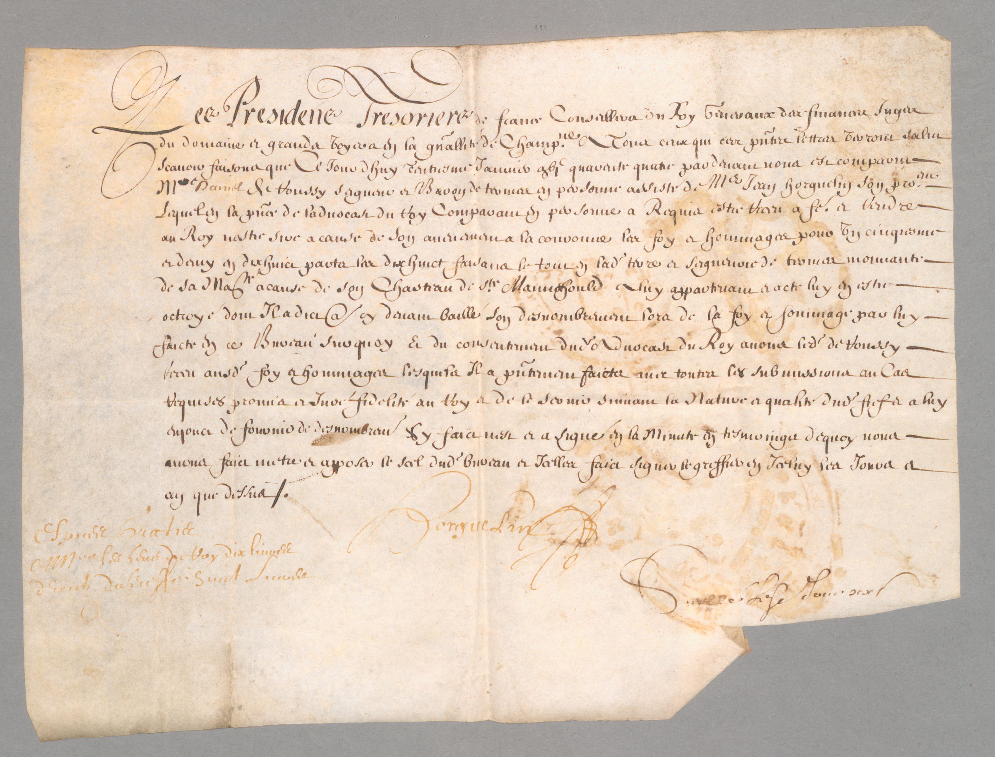 Texte 1 : Acte de foi et hommage au roi par Daniel de Roucy, seigneur et baron de Termes, pour ses parts dans la seigneurie de Termes (1644)