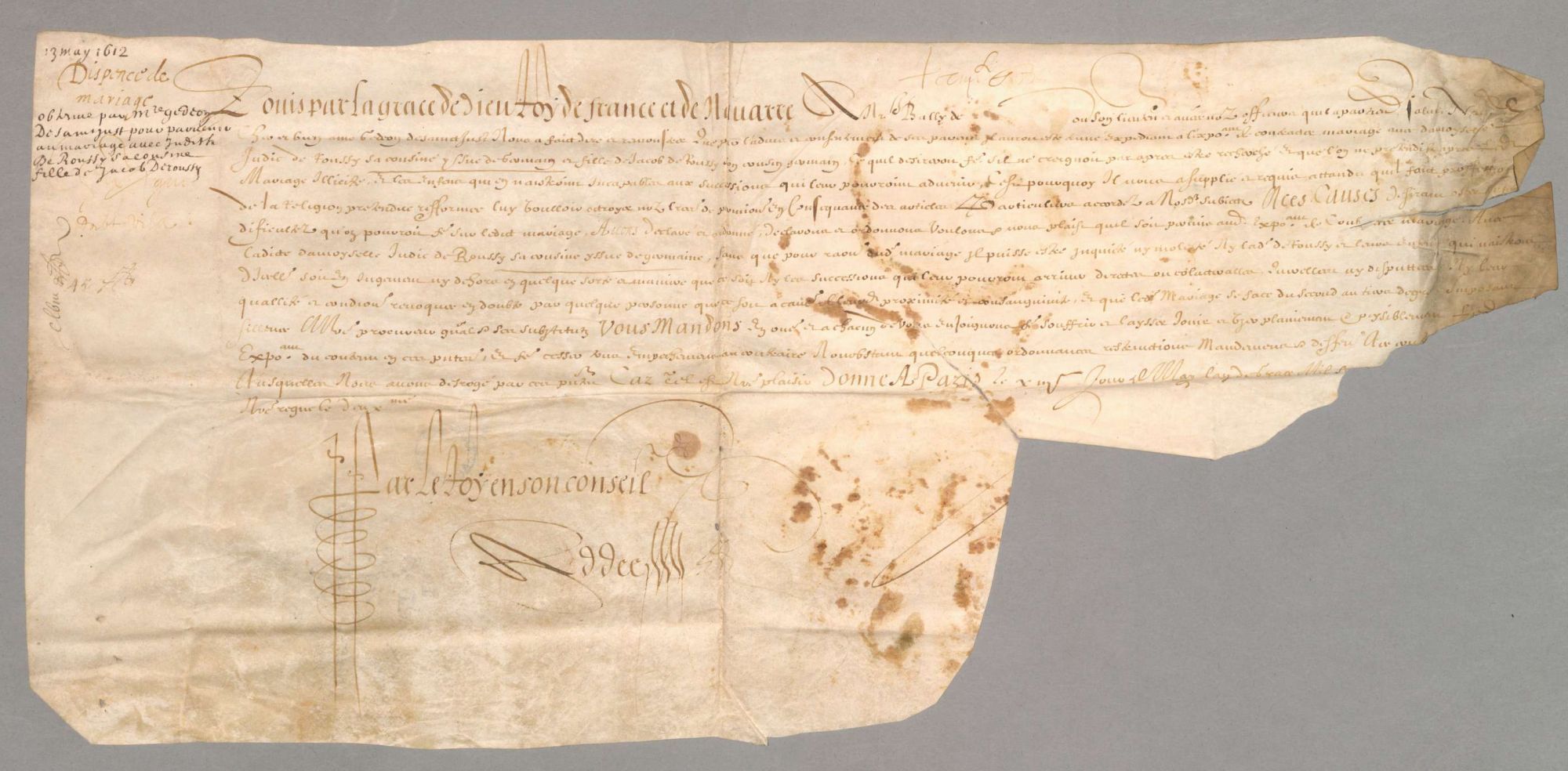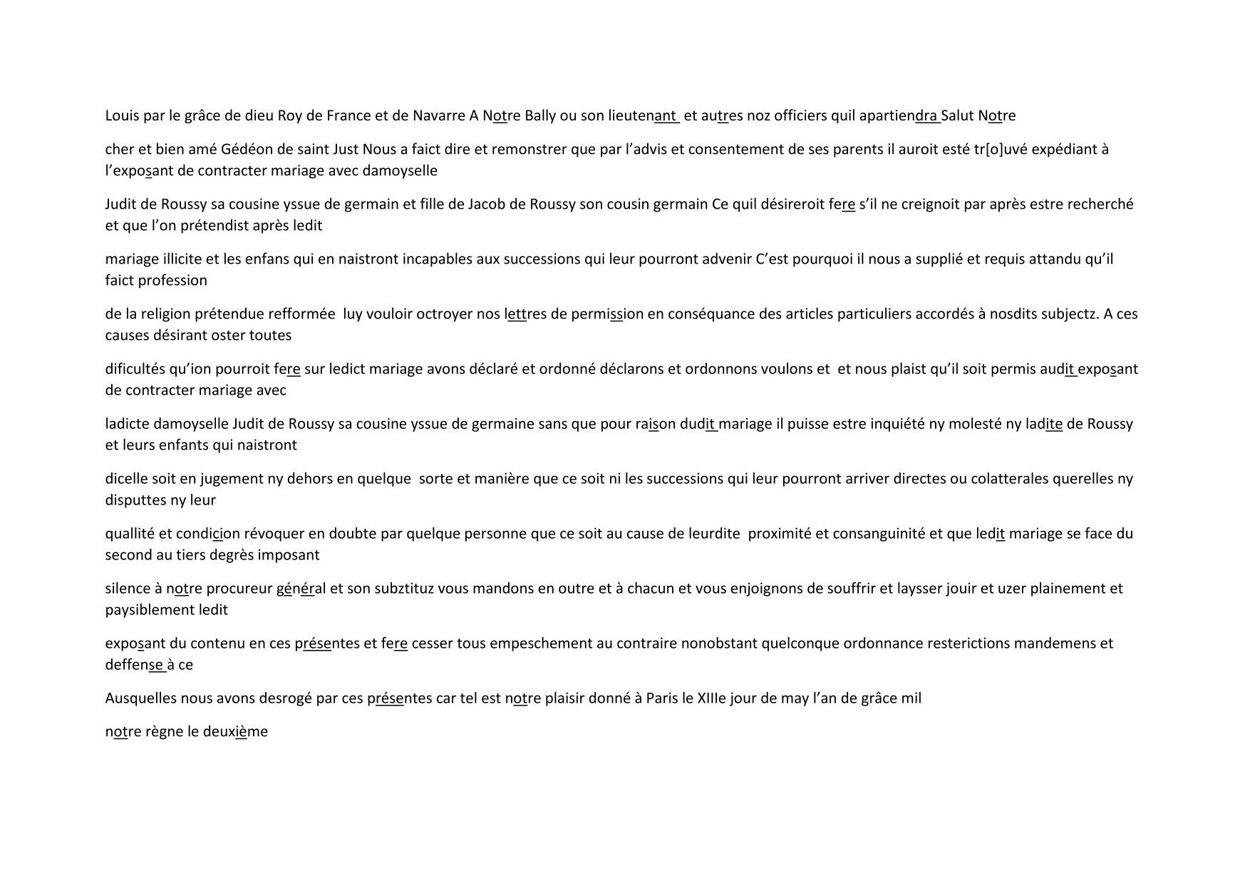 Texte 2 : Dispense de mariage du roi Louis XIII à Gédéon de Saint-Just et à sa cousine Judith de Roucy (1612)