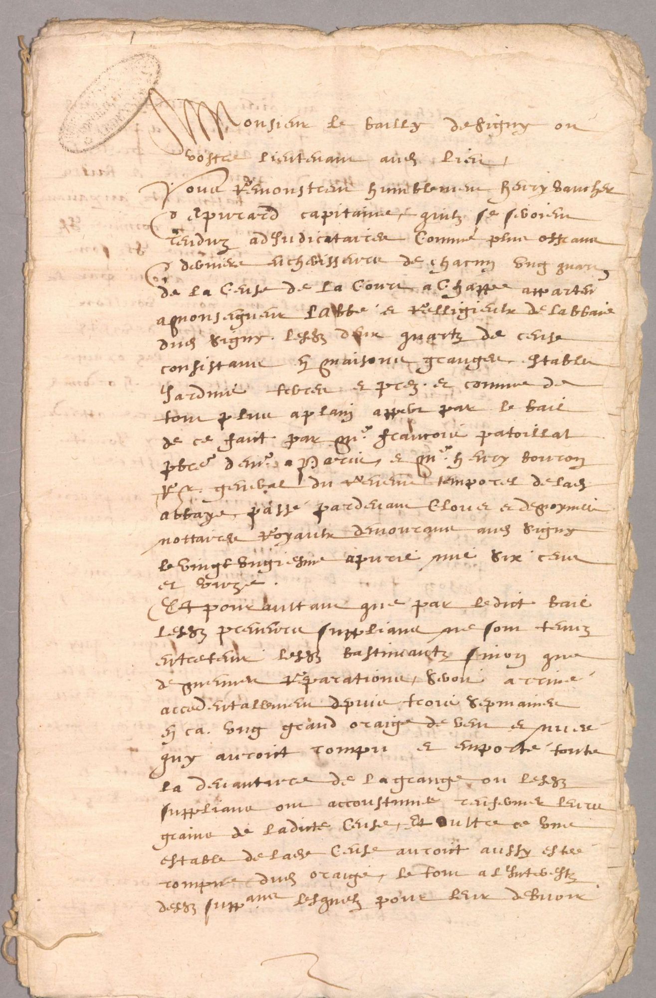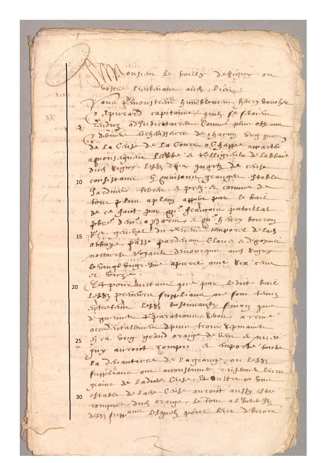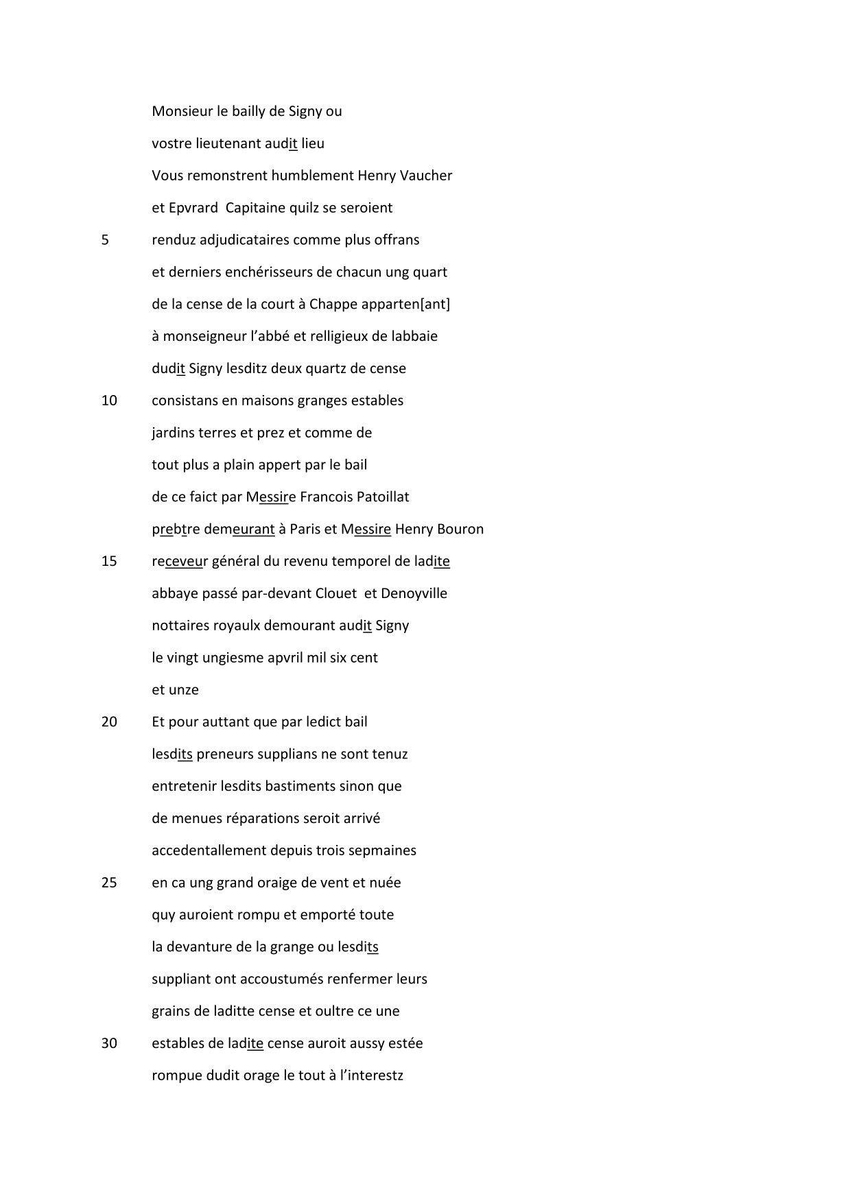 Ce document est extrait du fonds d'archives de l'abbaye de Signy. Suite aux destructions causées par un orage, deux adjudicataires de la cense de la cour à Chappes demande à l'abbaye de Signy, propriétaire de la cense, de prendre en charge les travaux de réparation. Un charpentier expert est alors désigné pour dresser un procès verbal de visite précisant les réfections à entreprendre. Ce document étant très long, seul le texte comportant une barre noire dans la marge est transcrit.