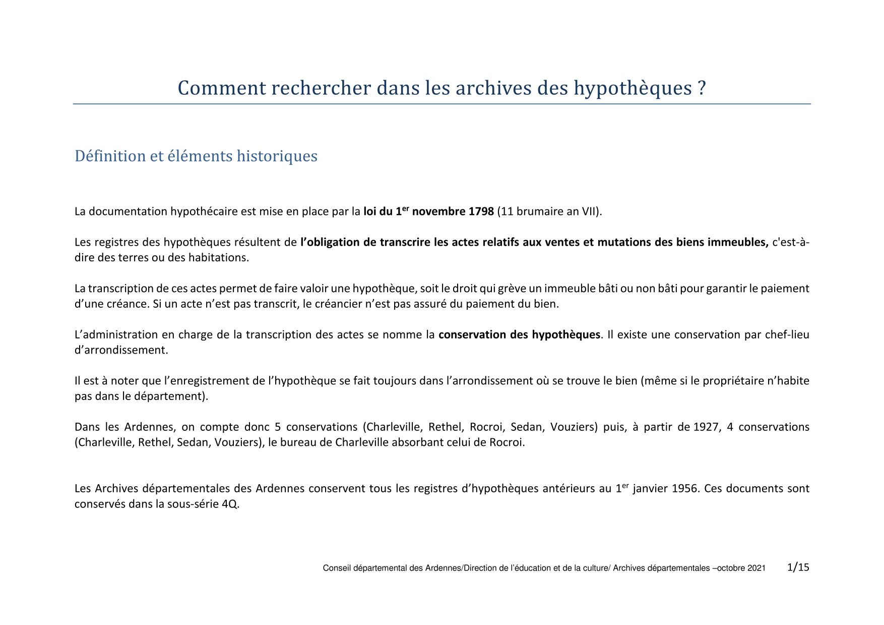 La recherche en ligne s’effectue par conservation des hypothèques, avec pour ressort géographique l’arrondissement. Attention donc pour l’arrondissement de Rocroi, qui ne couvre pas toute la période ; la conservation des hypothèques de Rocroi a été rattachée à Charleville.