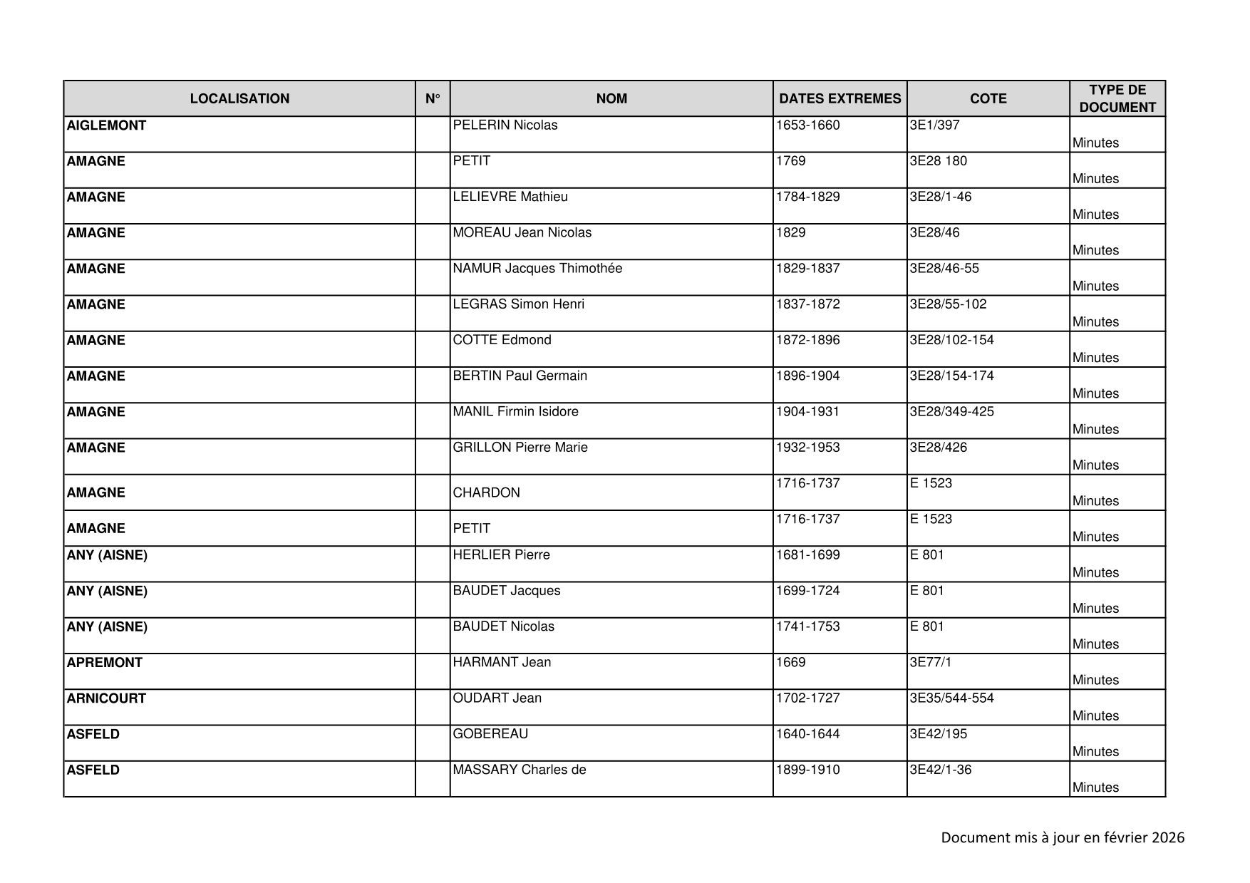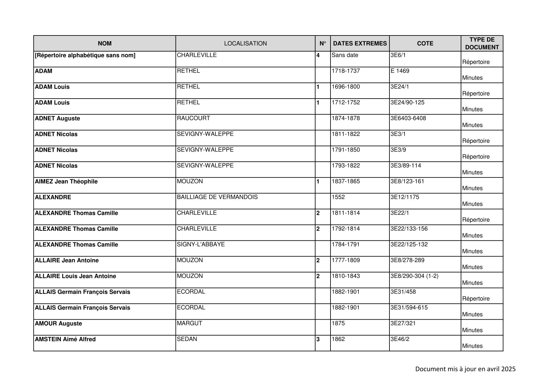 Attention ! Tous les répertoires ne sont pas encore numérisés et tous les actes n’ont pas forcément un répertoire les concernant. Si votre recherche en ligne est infructueuse, cela ne signifie pas que l’acte n’est pas conservé aux Archives. Renseignez-vous en salle de lecture pour pouvoir poursuivre votre recherche.