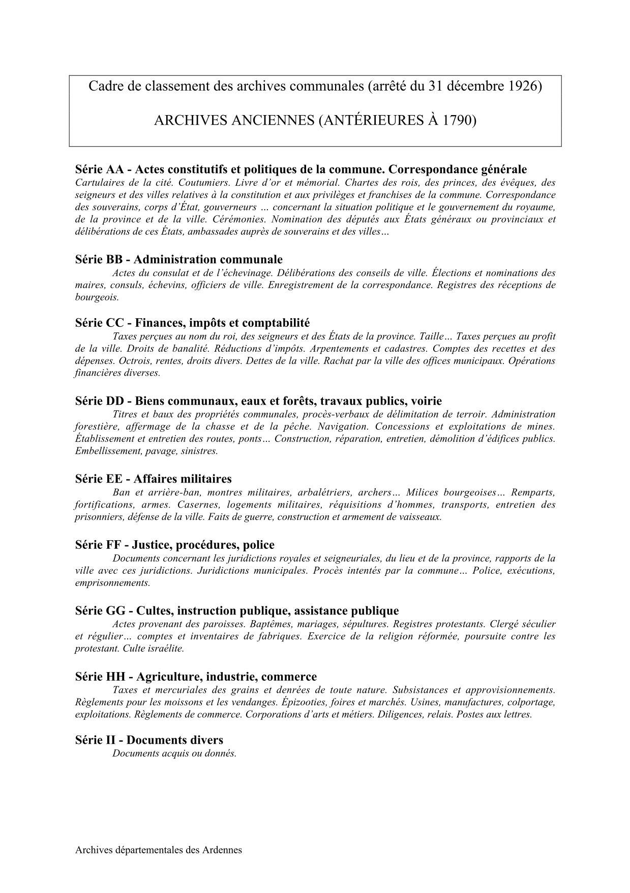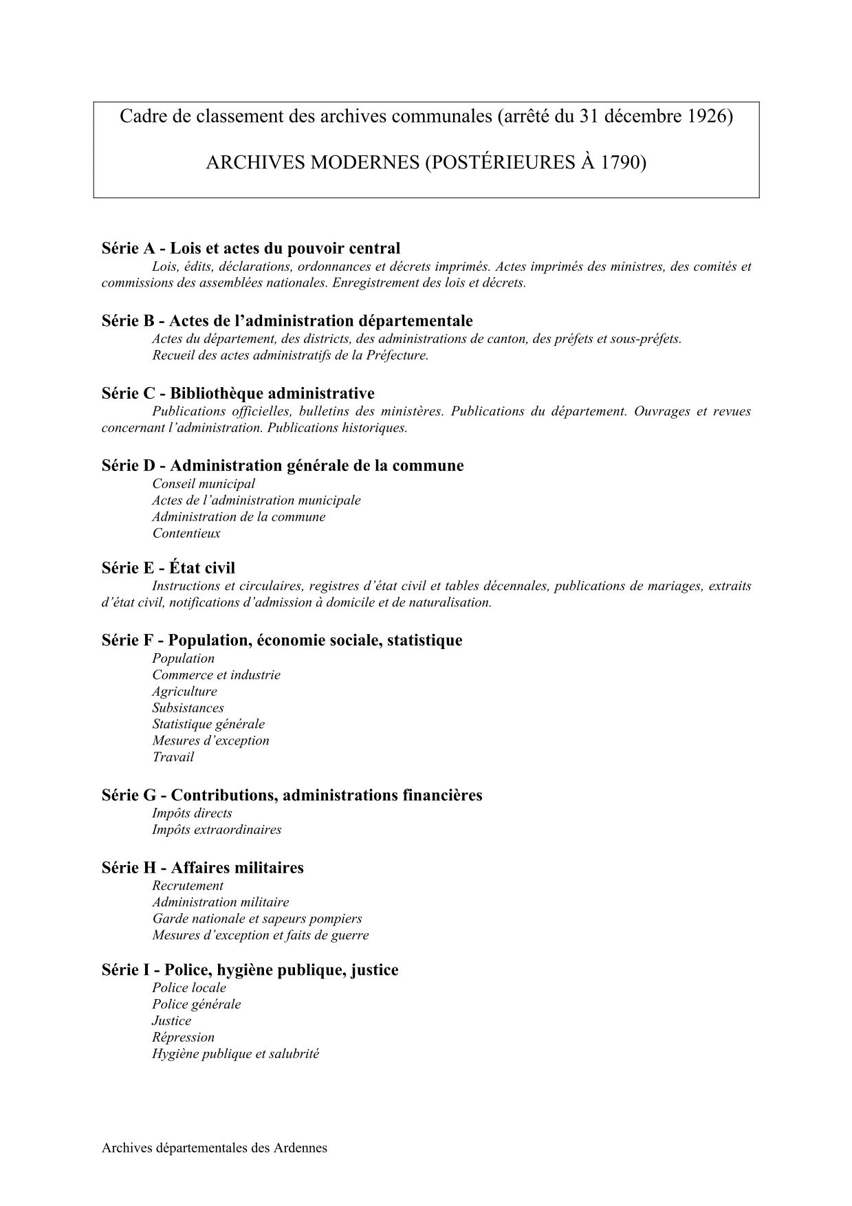 - Cadre de classement officiel de 1926 (valable pour les archives de l’Ancien régime et moderne) :