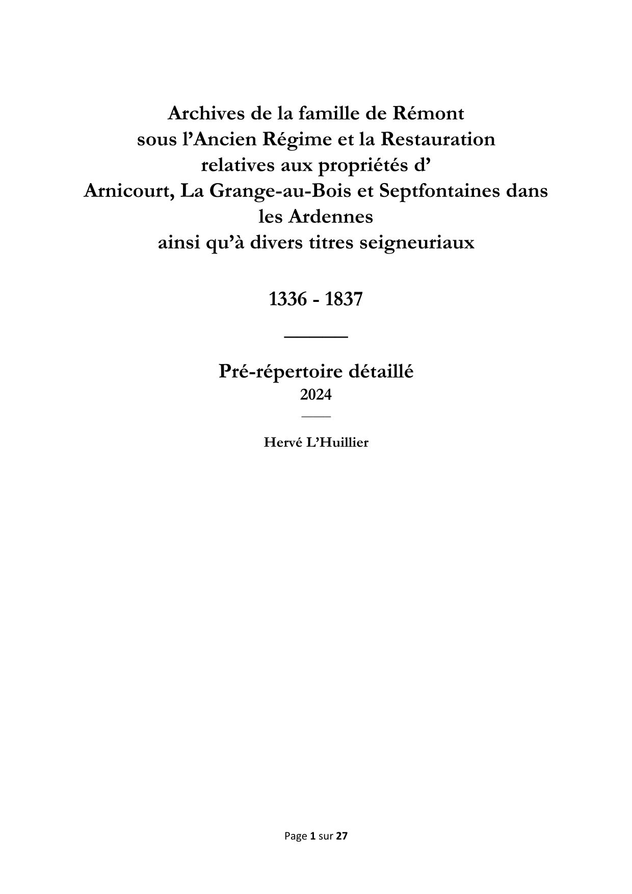 Propriétaire de l’abbaye de Septfontaines à Fagnon au XIXe siècle, se trouvent également dans ce fonds des documents sur sa fondation, la période de commende au XVIIe siècle, certains aspects de son existence au XVIIIe siècle et enfin sa situation au début de la Révolution. Charles-Angélique de Rémont ayant épousé Louise Coulon de La Grange-aux-Bois, des documents relatifs à ce domaine situé à Warcq sont également présents.