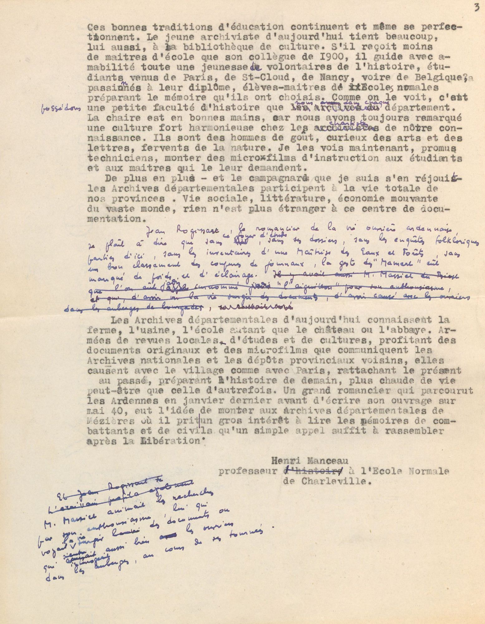 Henri Manceau nait le 9 décembre 1907 à Marquigny dans une famille de cultivateurs. Il se réfugie dans l’Aube avec sa mère durant la première Guerre mondiale. En 1919, il rentre à l’internat de l’école primaire supérieure de Mézières. Il intègre l’Ecole normale de Charleville en 1923 (reçu premier au concours) puis en 1926 l’Ecole normale supérieure de Saint-Cloud jusqu’en 1929. Nommé professeur d’histoire-géographie, il enseigne à l’Ecole normale de Mirecourt puis celle de Charleville en 1932.