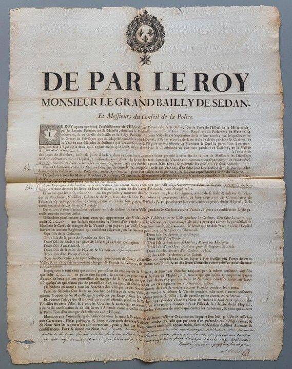 8 documents prêtés dont des liasses d’ordonnances de médecin (1890), un registre d’admission et réception des pauvres (1763- 20 brumaire an IV), une affiche de privilège accordé par le roi à l’hospice de Sedan de vendre seul de la viande pendant le carême (1788).