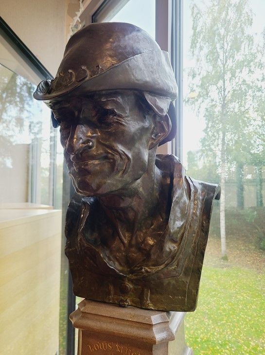 Il s’agit du buste du roi Louis XI en bronze et de sa gaine en chêne, bien connu des usagers de la salle de lecture depuis les années 1970. Il a été coulé au début du XXe siècle et est un détail du monument réalisé à Bourges en hommage au roi par le sculpteur Jean Baffier (1851-1920), natif du Cher.