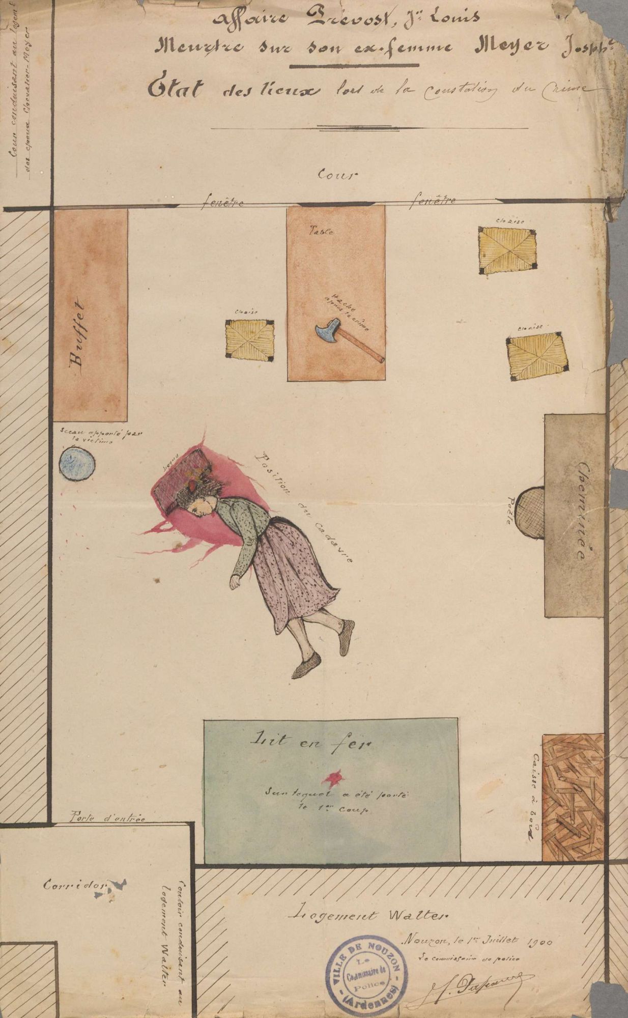 Le document présenté ici, fait partie du dossier lié à l’assassinat d’un homme sur son ex-épouse survenu en 1900 à Nouzonville. Il vient complèter les nombreuses pièces écrites à la plume relatant les descriptions de la gendarmerie, les témoignages et avis médicaux, ainsi que toutes les pièces nécessaires à l’enquête puis au jugement. Ce dessin, particulièrement soigné est une feuille de papier proche d’un A4 réalisé à la plume et au lavis d’aquarelle. En bas à droite, on peut remarquer le tampon et la signature du commissaire de police ainsi que le lieu et la date du relevé. Un grand soin est apporté à la fidélité de la reconstitution du lieu avec les logements voisins et la pièce où le crime a été commis. L’emplacement du mobilier, du corps et même des traces de sang (à gauche) est reporté. La chronologie des faits est retracée précisément dans le rapport de la police.