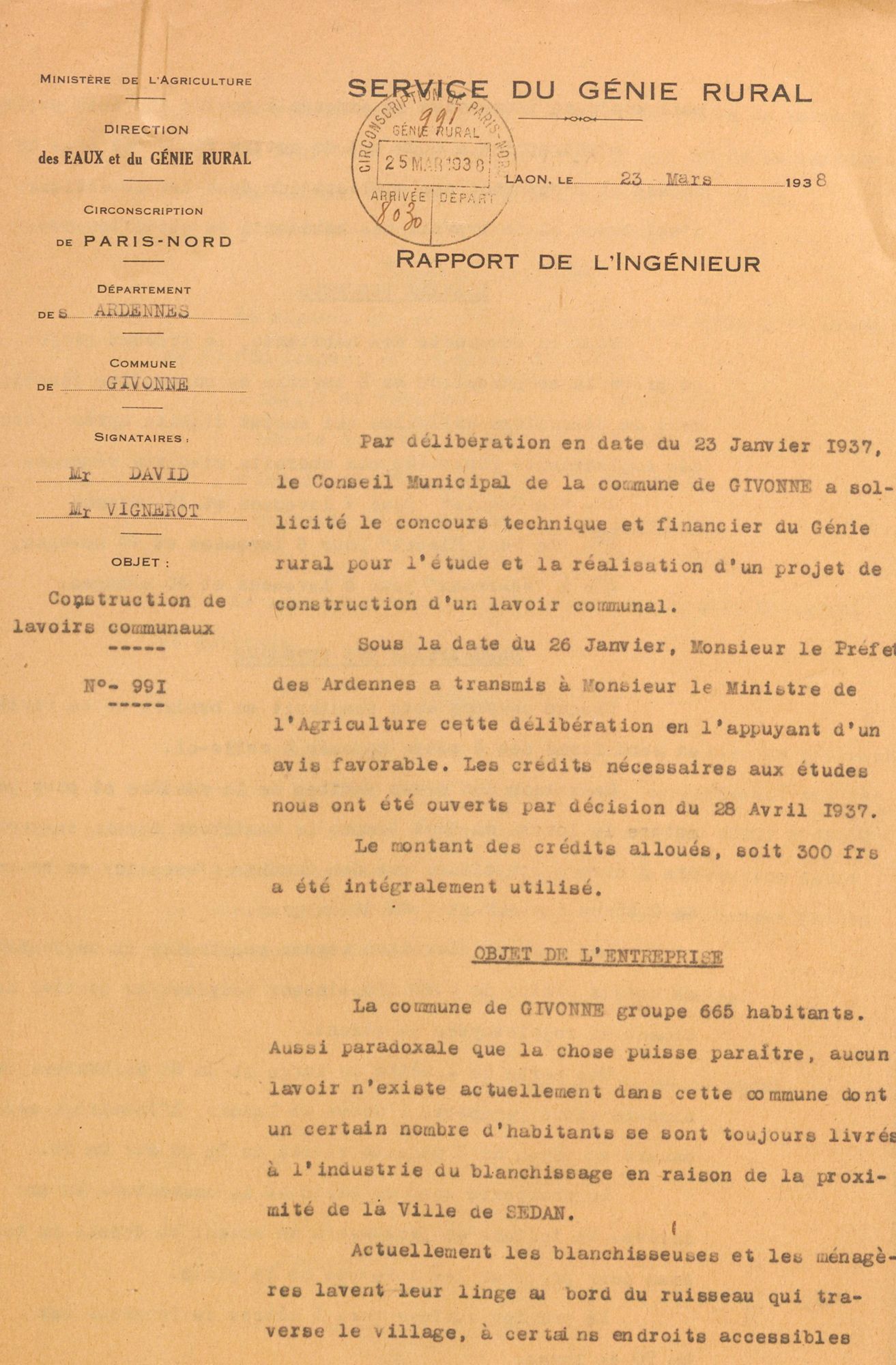 En 2014, un important versement d’archives liées à l’alimentation en eau potable des communes ardennaises a été réalisé par la Direction départementale des territoires aux Archives départementales des Ardennes. Il représentait alors à 40,2 mètres linéaires, ce qui correspondait à 420 boites. Un premier classement aboutit à réaliser quelques éliminations à le réduire « seulement » à 398 boites. En 2024, un classement plus systématique du fonds a été entrepris afin de rendre ces archives mieux exploitables et consultables par les lecteurs.