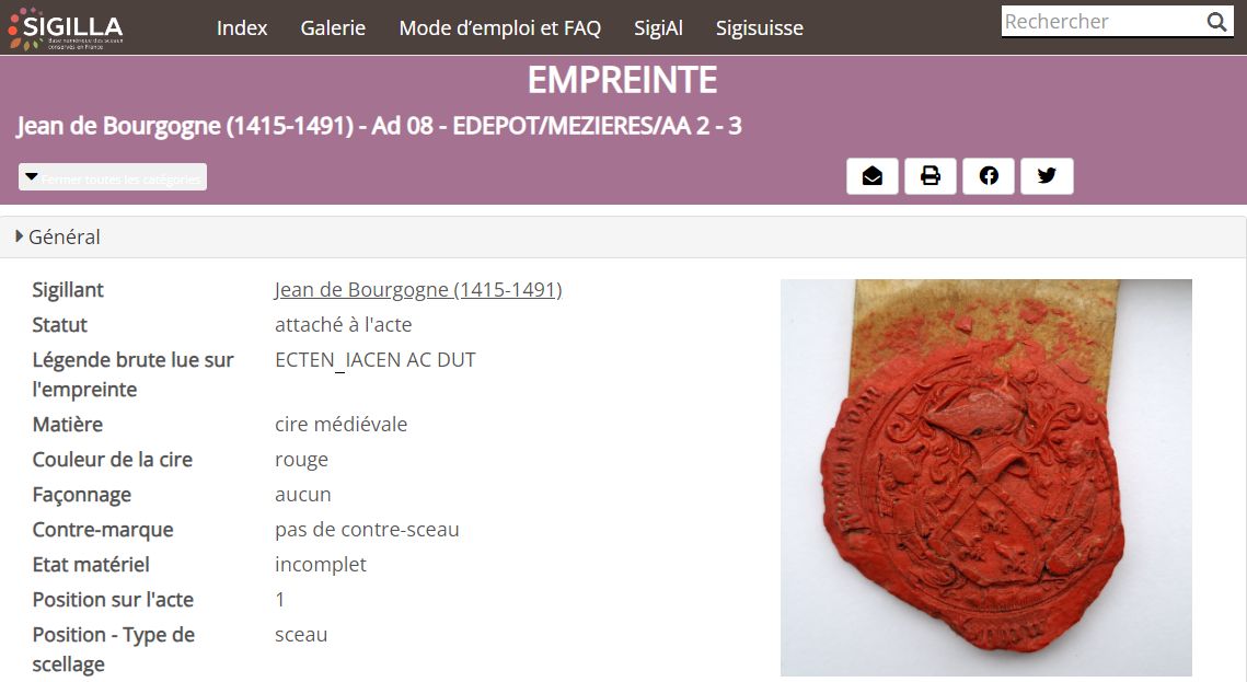 Au terme de ce travail, 117 empreintes attachées à 101 actes et 2 matrices ont été identifiées et sont conservées dans les séries H, G, E, EDEPOT et HDEPOT. Outre les fonds propres des AD08, les archives communales de Sedan et Revin et les collections de la Société d’histoire et d’archéologie du Sedanais ont été sondées pour y déceler les empreintes dignes d’intérêt historique. À Revin, 9 empreintes et à Sedan, 12 empreintes ont ainsi été étudiées.