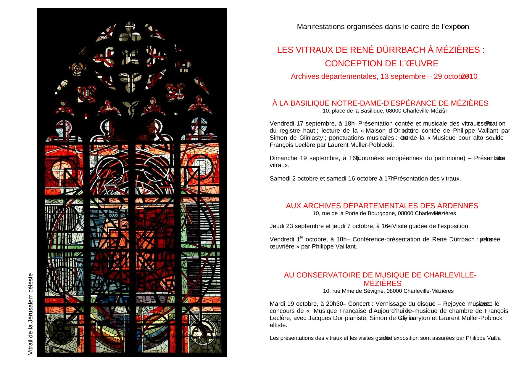 Cette exposition est réalisée en partenariat avec Philippe Vaillant, directeur de l’association « Les trois mondes », à l’occasion de la parution de son ouvrage Les vitraux de Mézières, œuvre de René Dürrbach. Des documents personnels, des reproductions de vitraux mais aussi des dessins, des écrits et des œuvres sculptées de René Dürrbach seront présentées. Plusieurs manifestations sont organisées en parallèle de l’exposition : présentations des vitraux, visites guidées de l’exposition, concert, conférence de Philippe Vaillant.