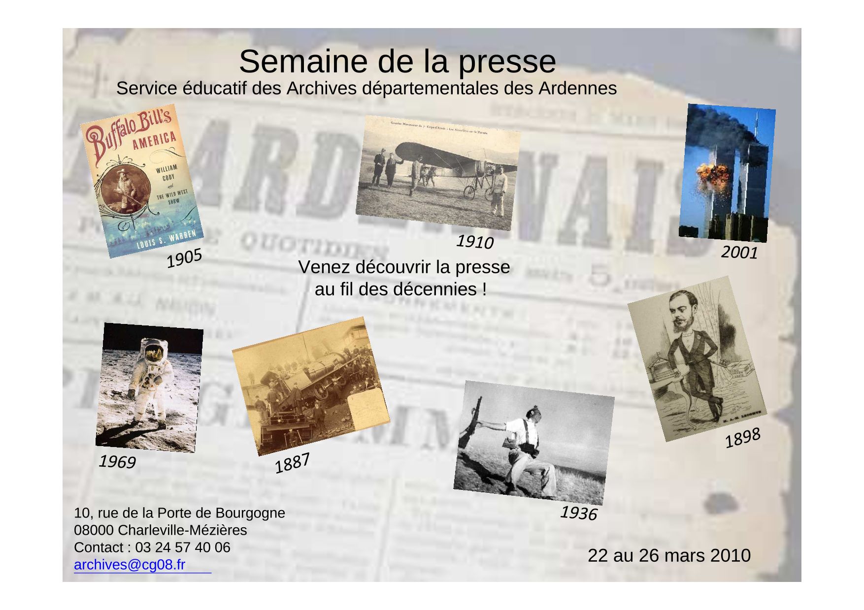 Du 22 au 26 mars 2010, les Archives départementales des Ardennes participent à la semaine de la presse en proposant divers ateliers à destination des scolaires de tous niveaux.