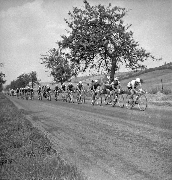 Illustration : passage à Tétaigne, près de Mouzon, de la 6ème étape (Charleroi-Metz, 248km) du 44e Tour de France en juillet 1957 (photographe : M. Alazard. AD08, NC.)