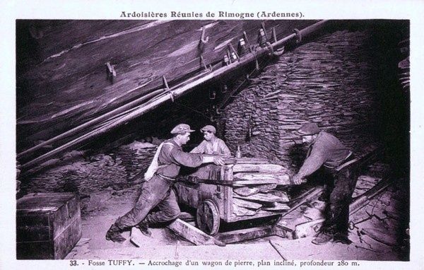 Dans les Ardennes, la première exploitation de l'ardoise, autrefois appelée écaille, remonte à 1158. Elle se fait alors à ciel ouvert et ce sont les moines des abbayes de Foigny, de Bonnefontaine et de Signy qui exploitent ces ardoisières. En 1779, Jean-Louis Rousseau crée la Compagnie des ardoisières de Rimogne. Le 14 octobre 1831 est fondée la Compagnie des ardoisières de Rimogne et de Saint-Louis-sur-Meuse, les parts de la société sont réparties entre les membres de la famille Rousseau. La compagnie rachète les autres exploitations concurrentes : celles de Truffy et Pierka créée en 1836, celle de la Fosse aux Bois créée en 1839, celle de la Rocaille en 1840 et celle de la Richolle en 1842. Le rendement de toutes les exploitations de Rimogne s'élève à 51 200 000 ardoises.
